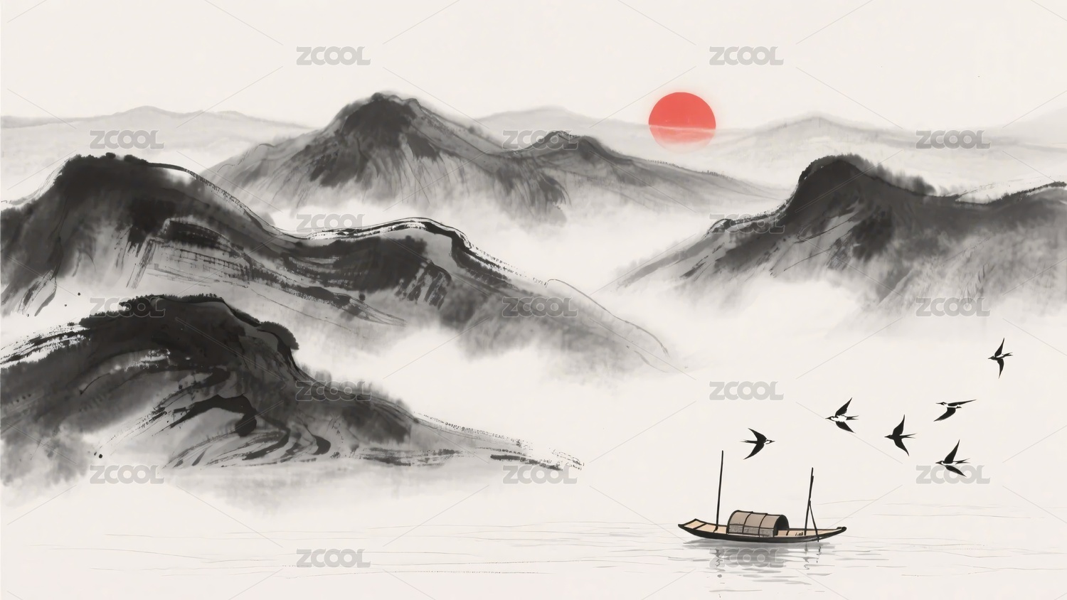 山水,红日,飞鸟,小船,水墨画,插画,中式,风景,自然,意境