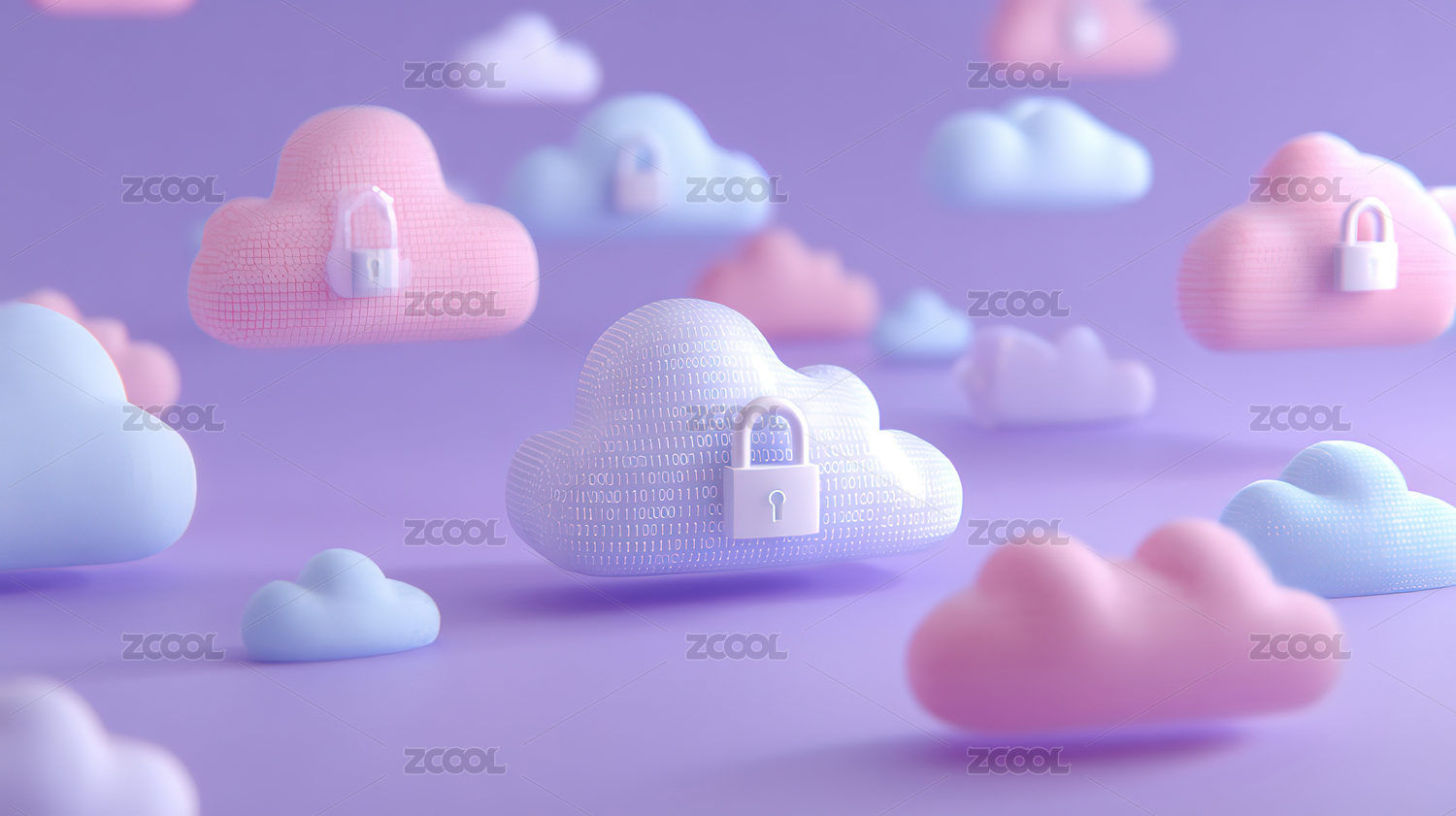带锁的云朵漂浮在紫色背景中