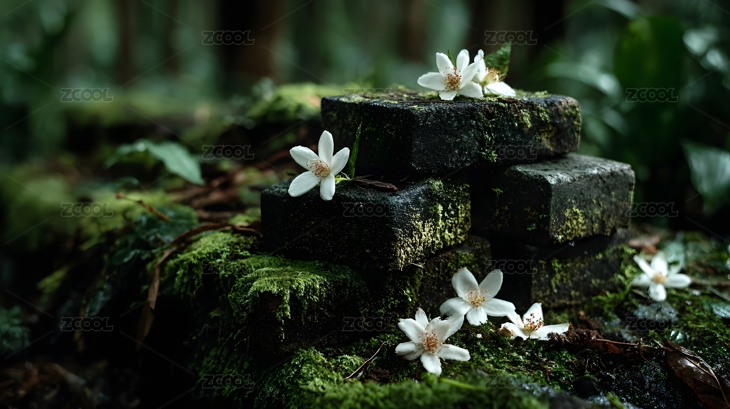 森林中的苔藓与白花