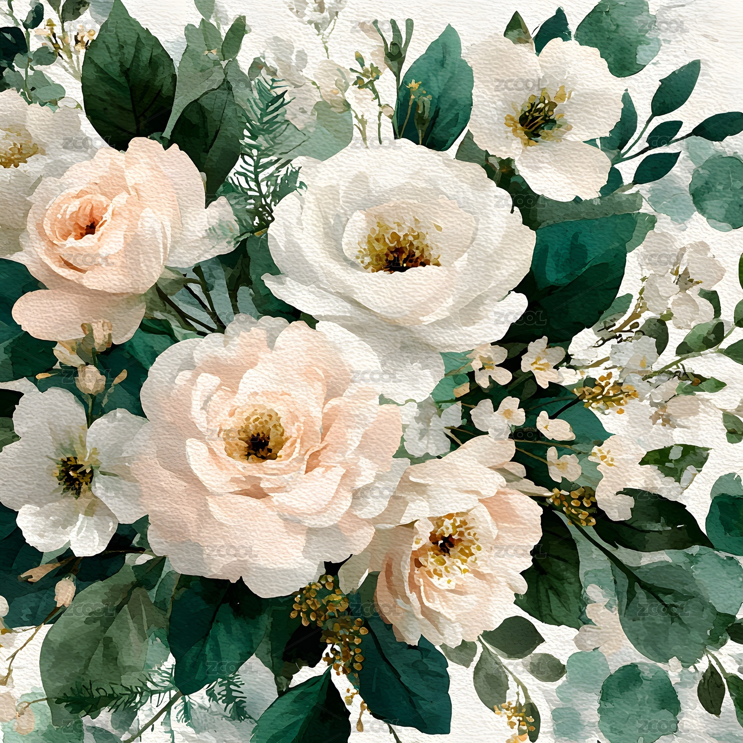 白花绿叶花卉图案