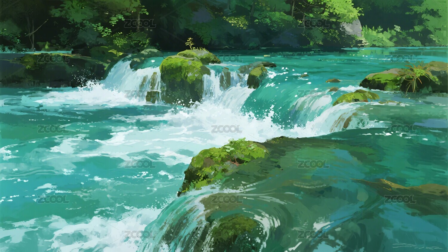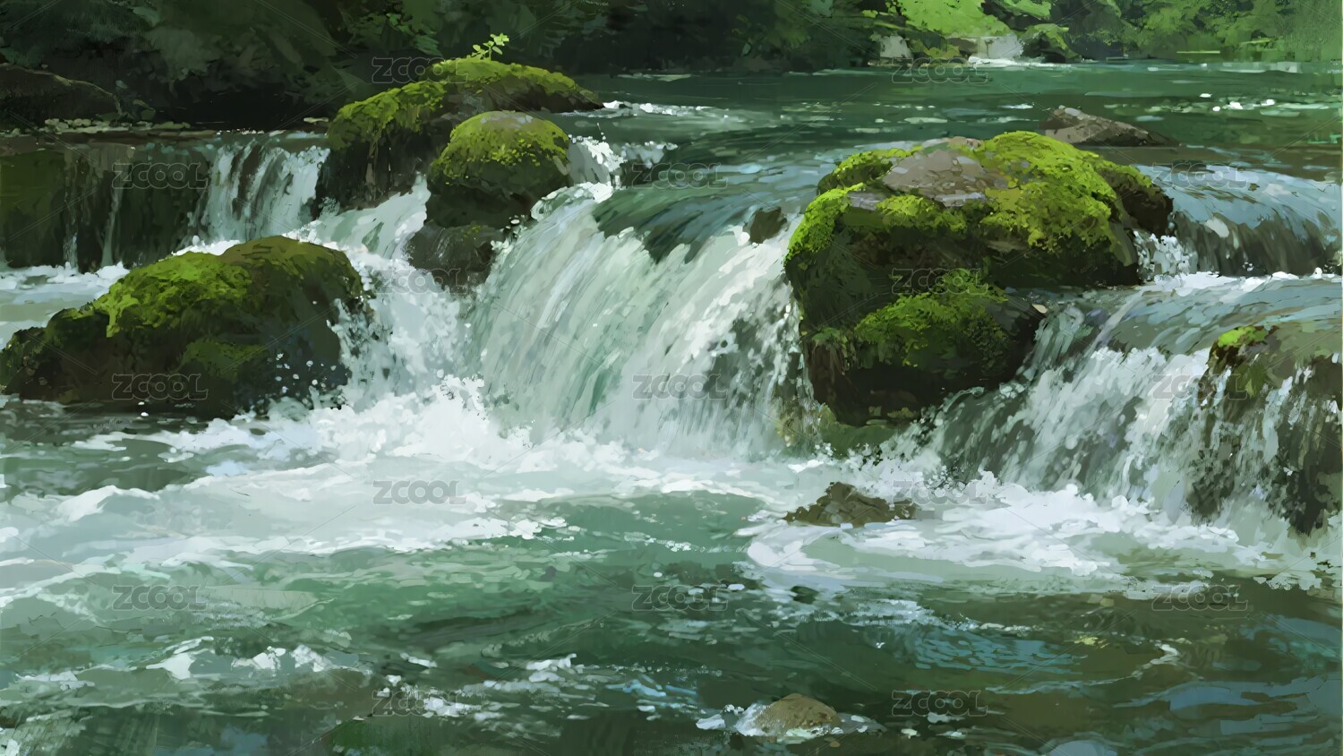溪流,瀑布,岩石,苔藓,自然,风景,水流,插画,画面元素,水景