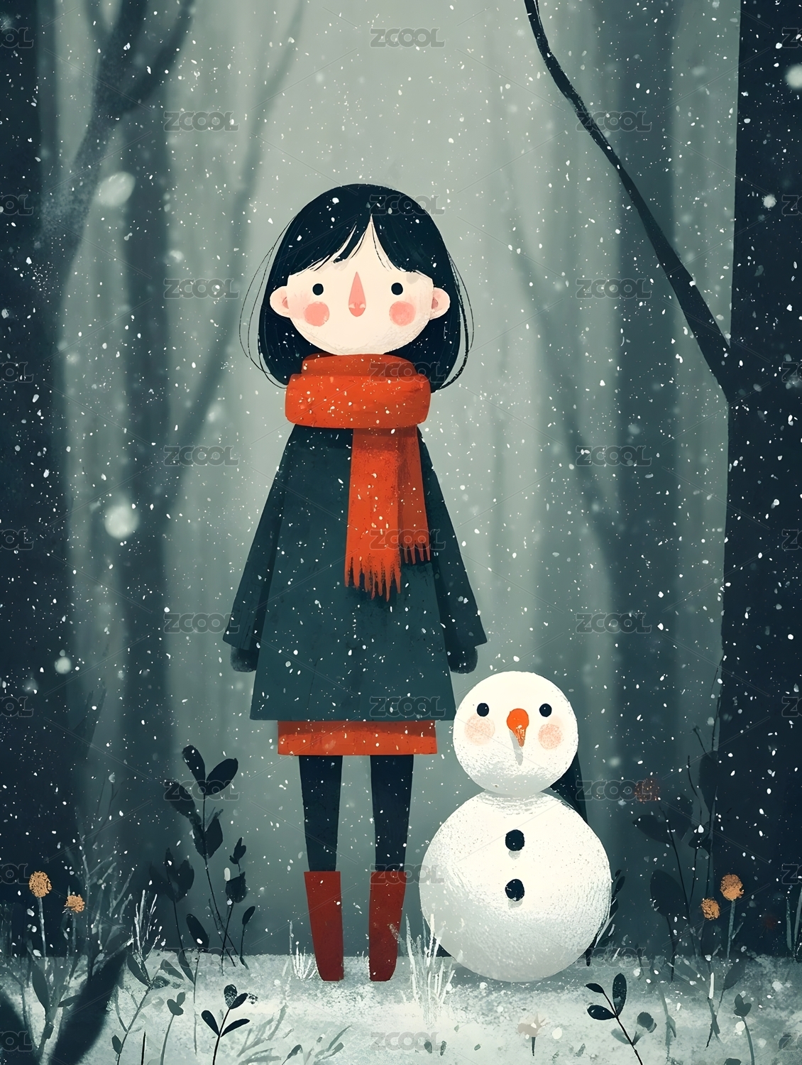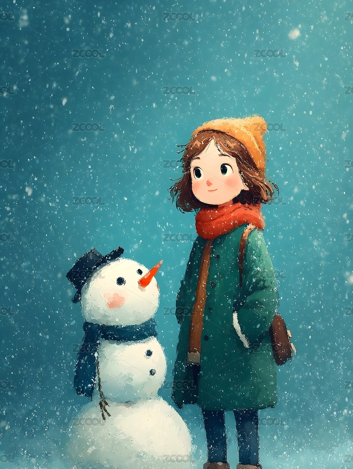 冬日雪景小女孩与雪人