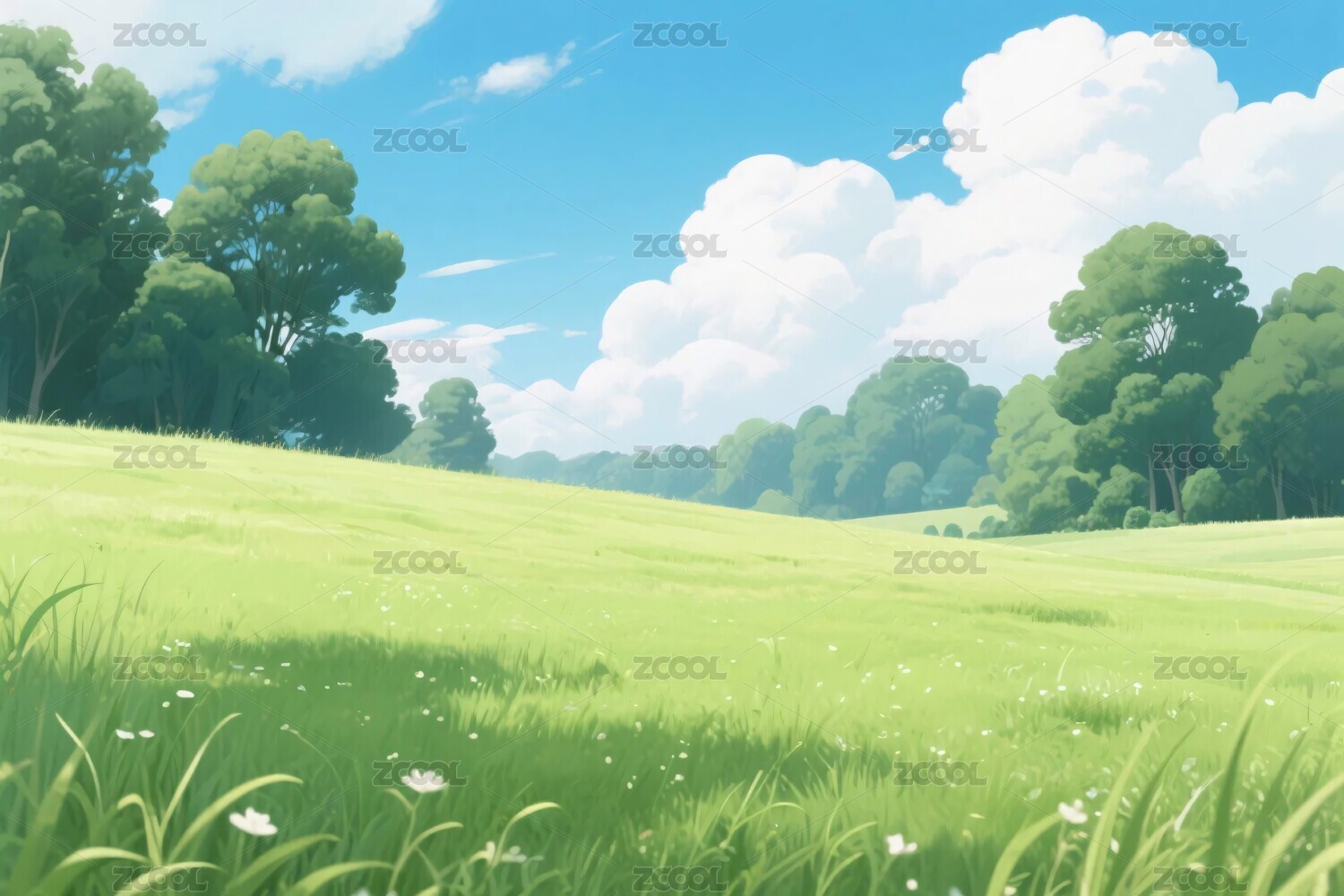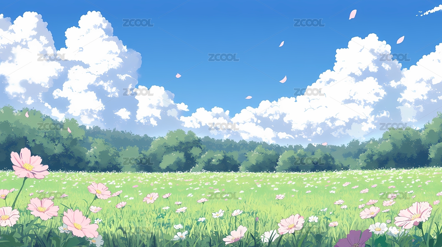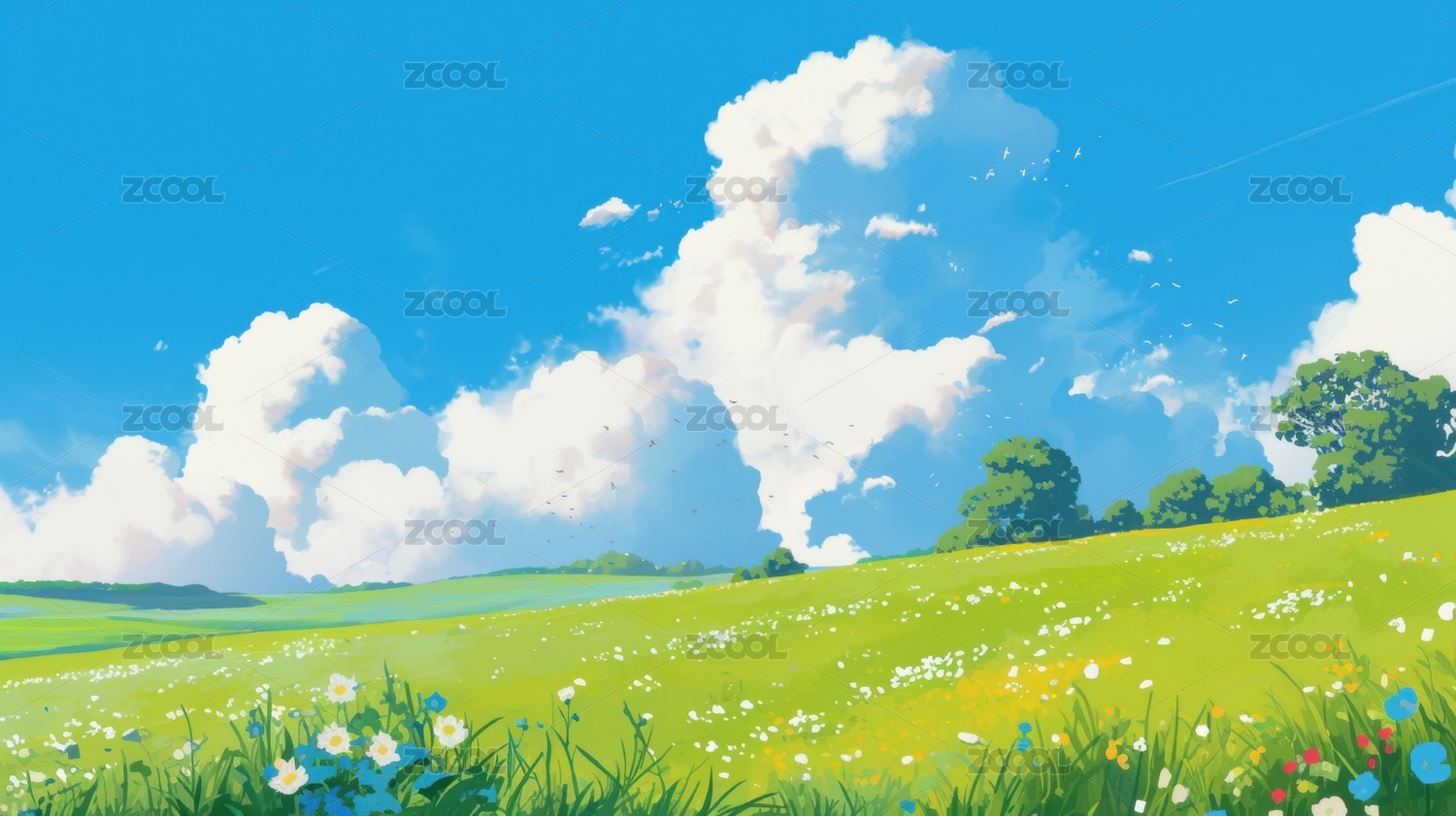 草地,雏菊,树木,蓝天,白云,插画,风景,自然,清新,矢量