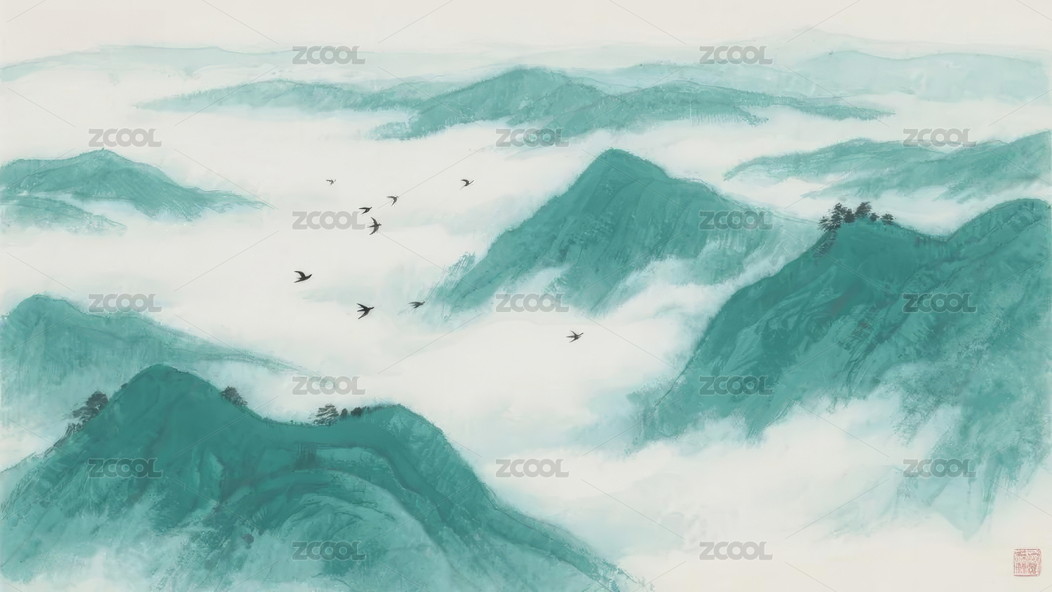 水墨风格青绿山峦景观