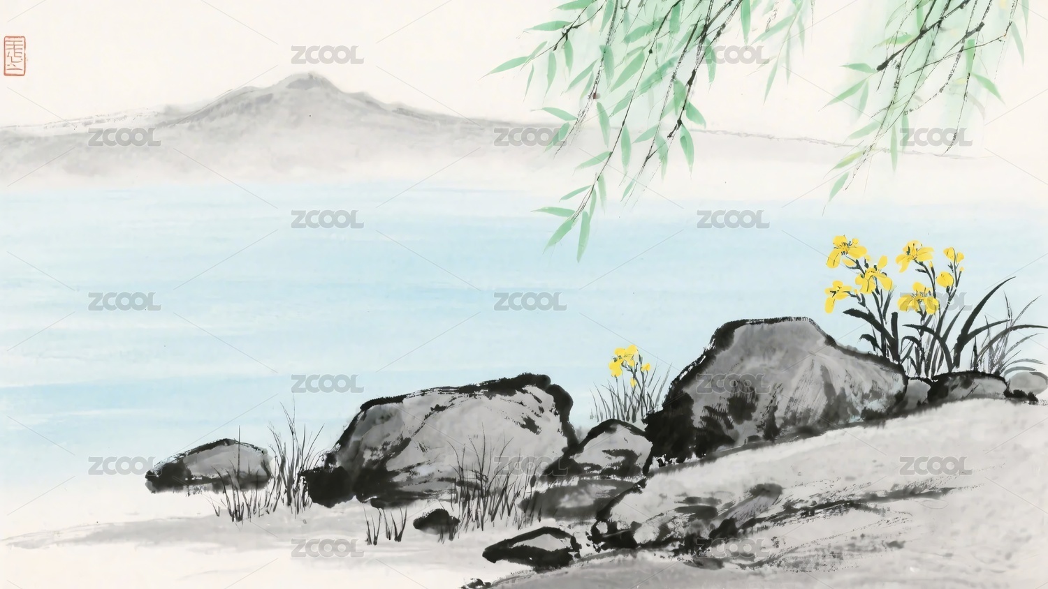 山水,柳树,花朵,插画,水墨,自然,风景,元素,中国风,写意