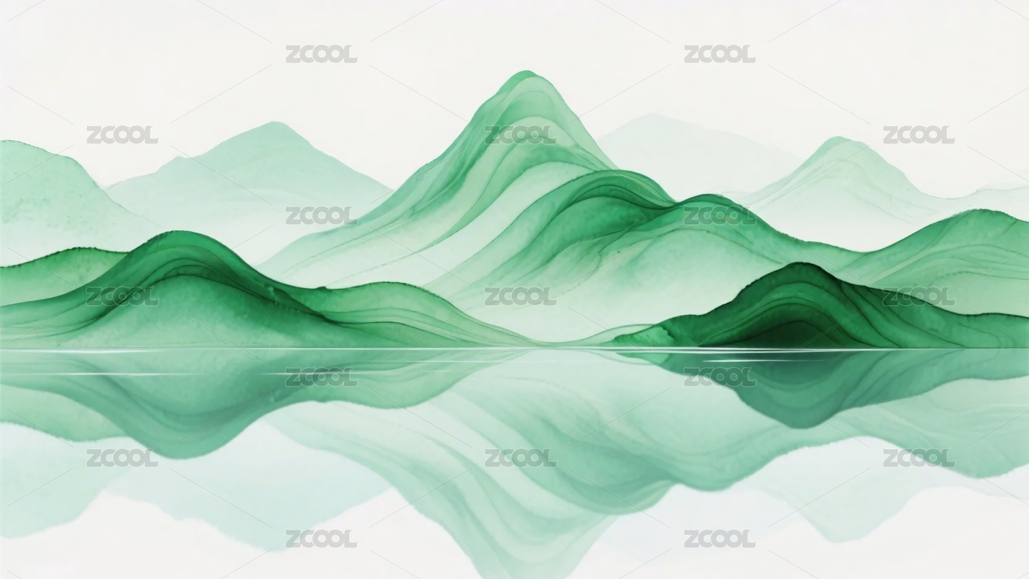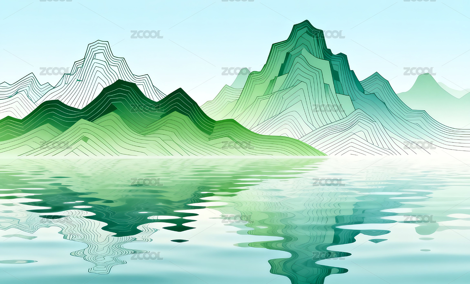 山水,风景,插画,自然,水墨画,绿色,湖面,倒影,山脉,静谧