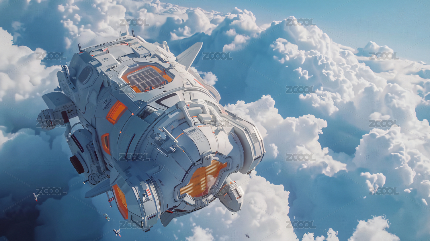 白云,科技,未来,白色,设计,蓝天,飞船,飞行,橙色,创意