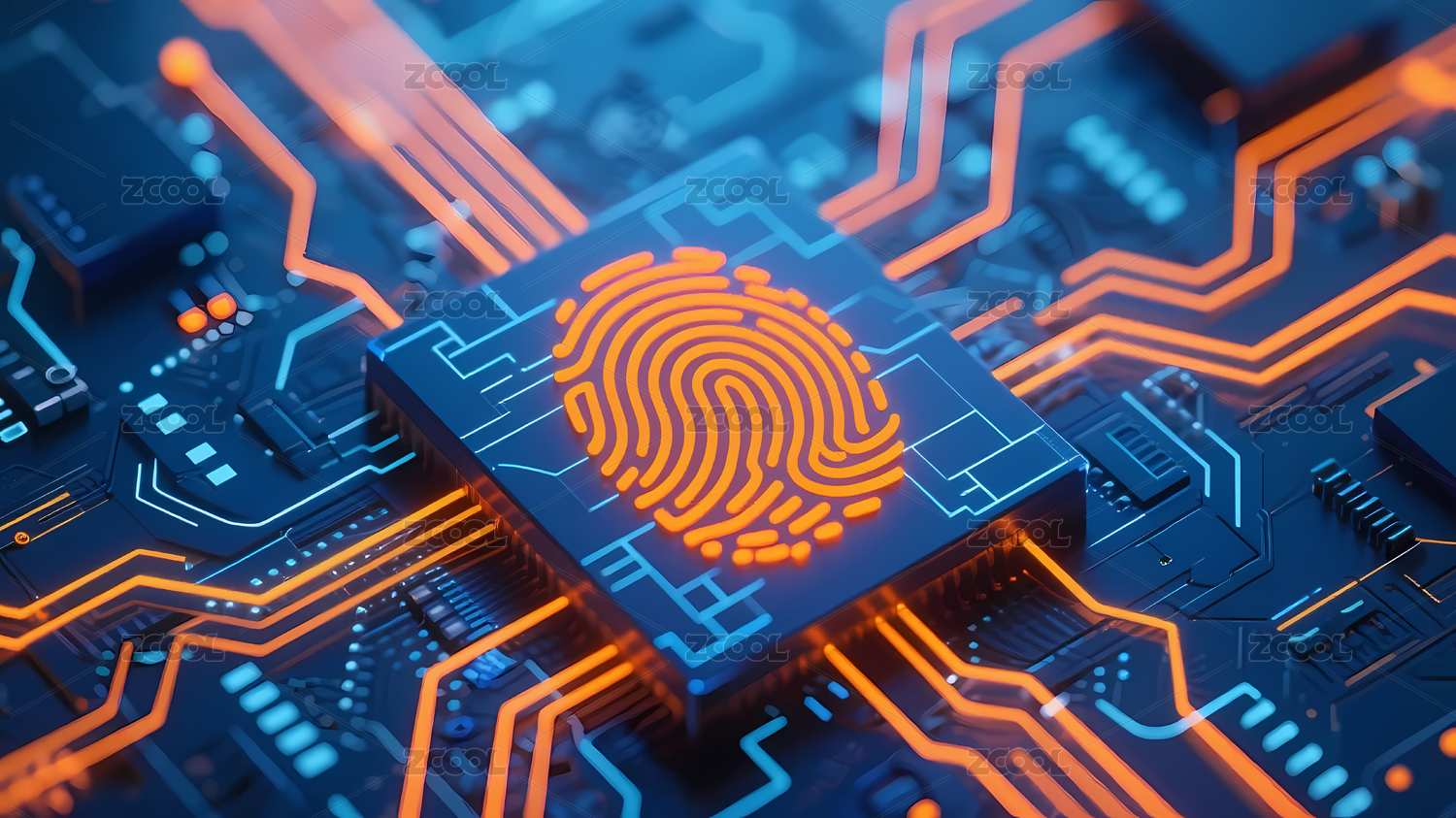 芯片,指纹,蓝色,电路,高科技,数字化,深色,背景,线条,橙色