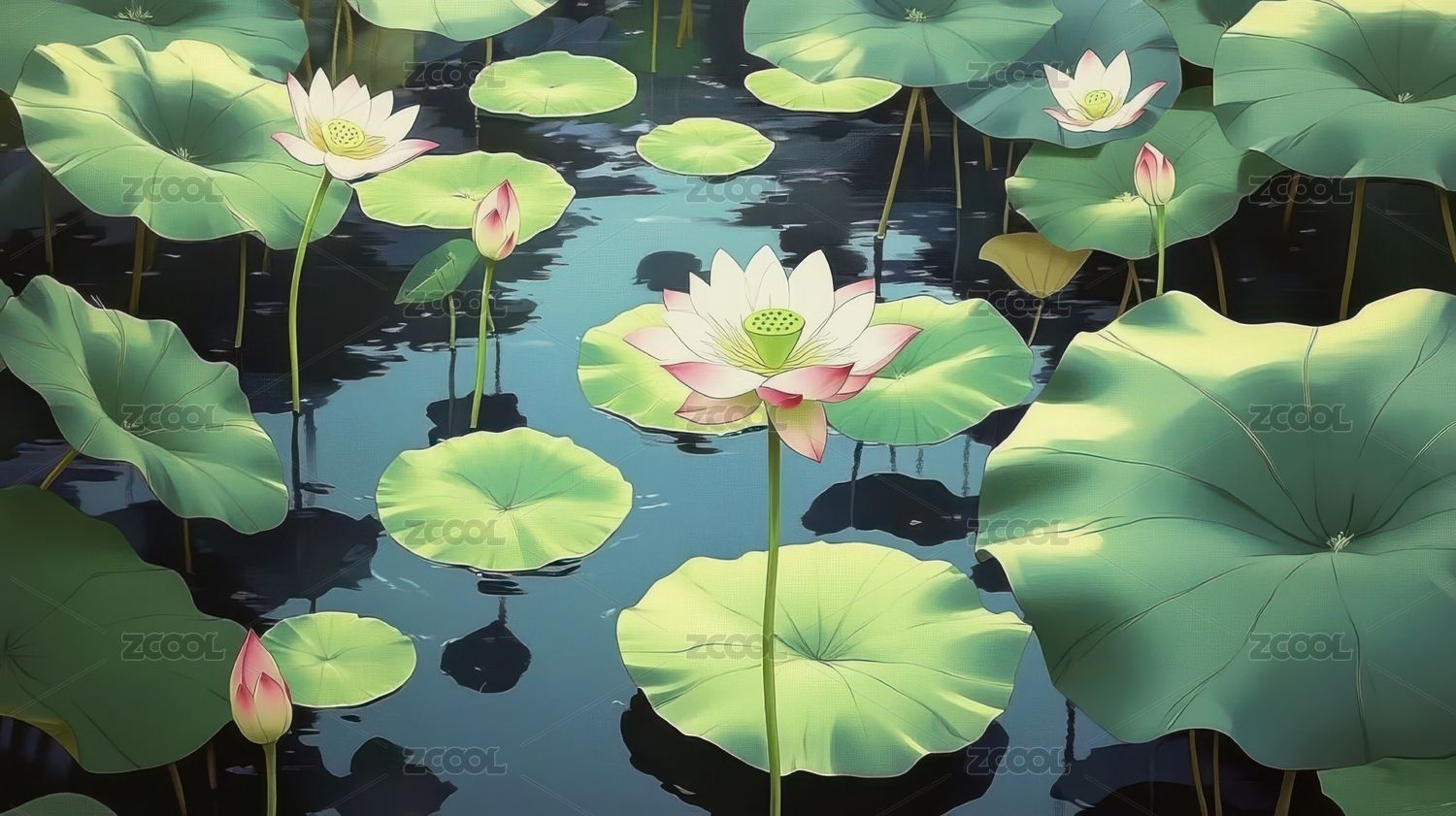 夏至荷塘盛开荷花与碧绿荷叶手绘插画