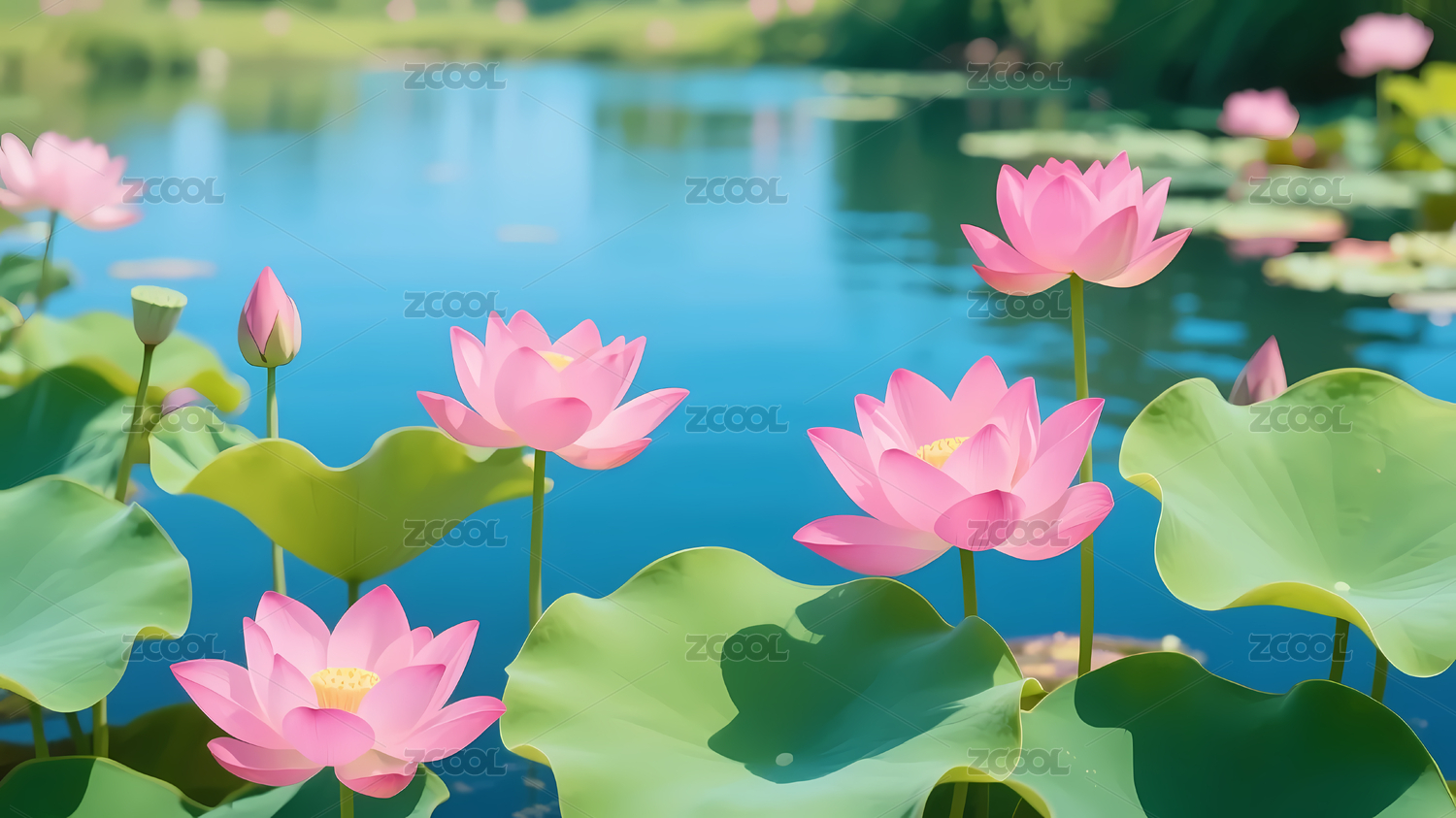 明亮,鲜艳,自然,蓝色,绿色,荷花,荷叶,水面,植被,生机