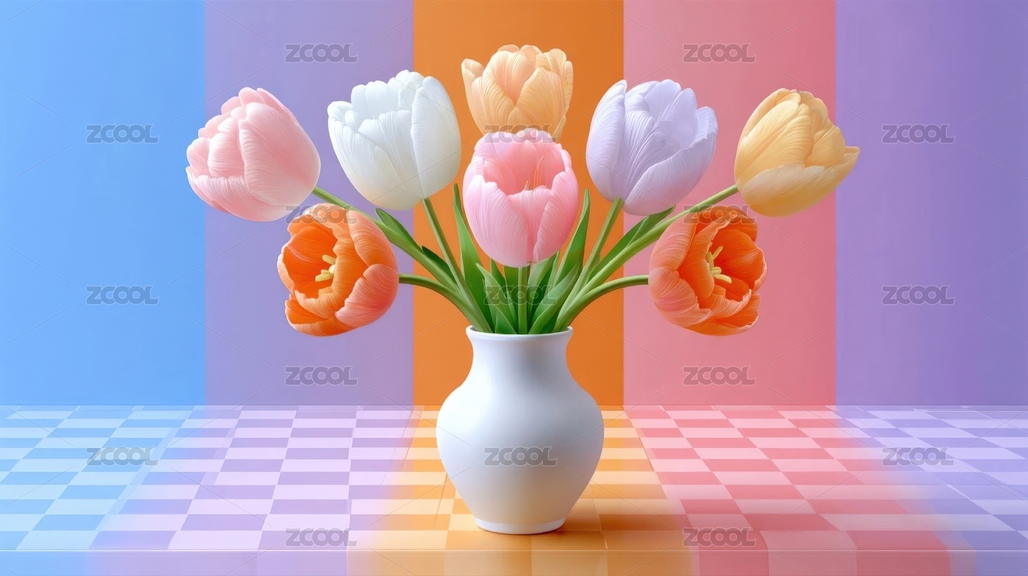 花瓶里五彩缤纷的郁金香花束