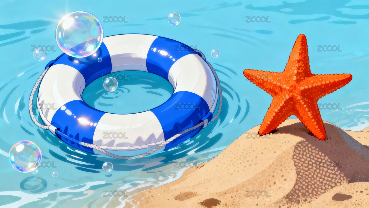 蓝色,自然,装饰,漂浮,清新,救生圈,海水,贝壳,花朵,棕榈叶