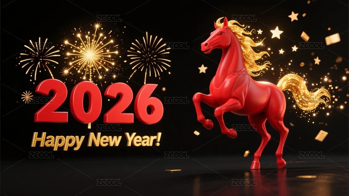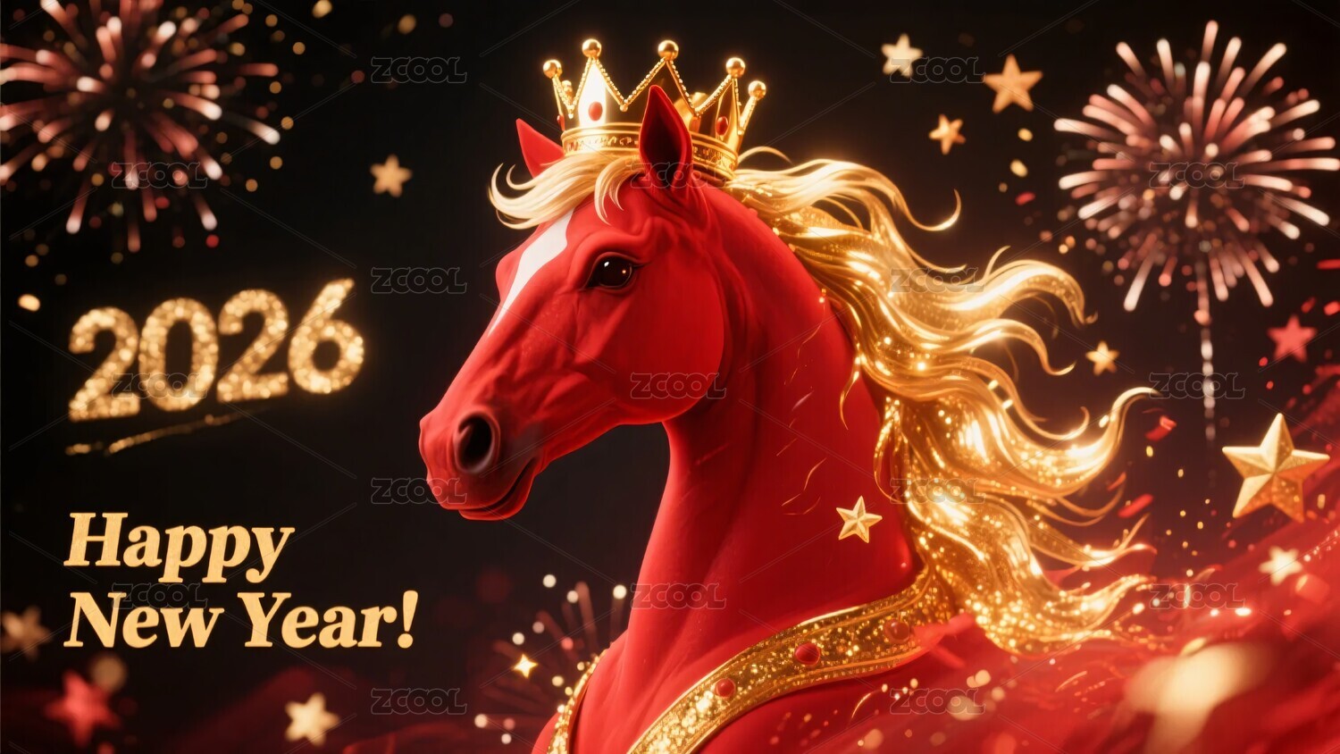 红色骏马,烟花,星星,新年,插画,贺岁,节日,元素,模板,背景