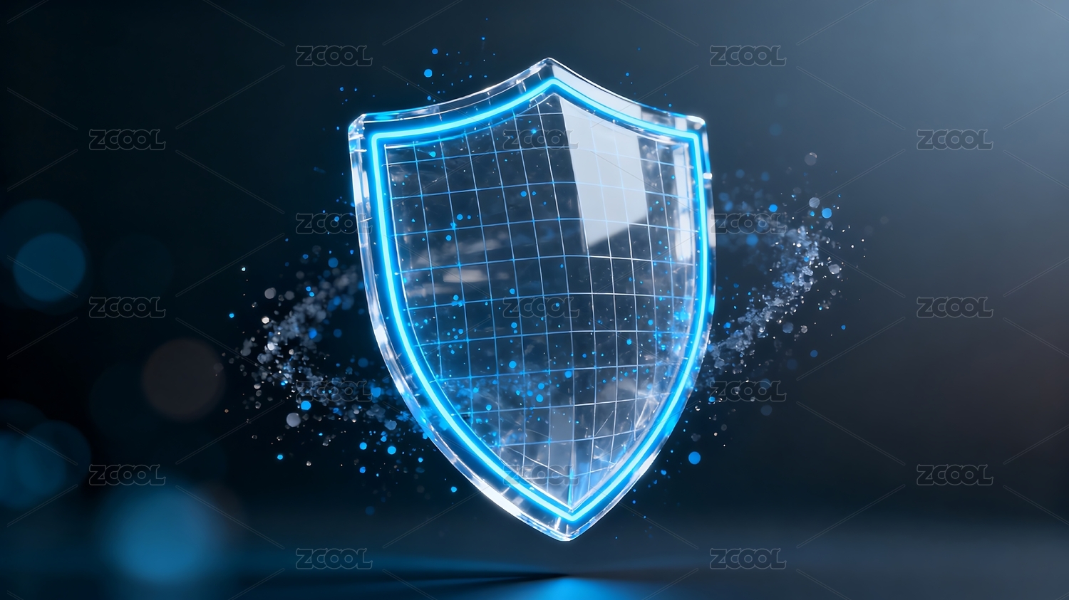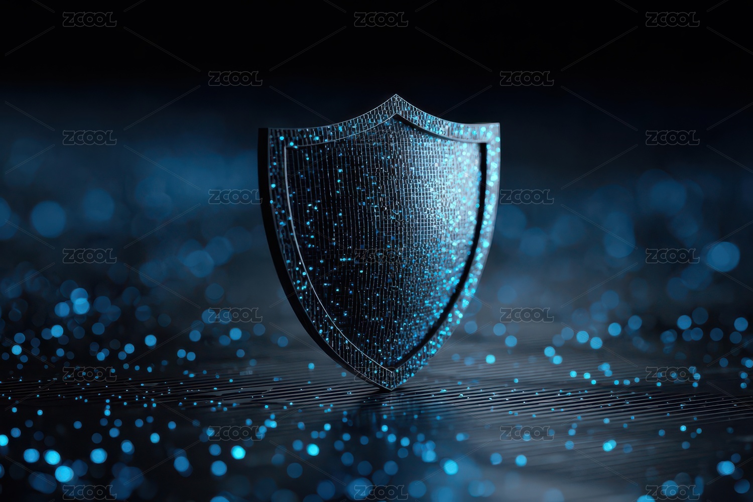 数字盾牌闪耀蓝色光点的科技防护场景