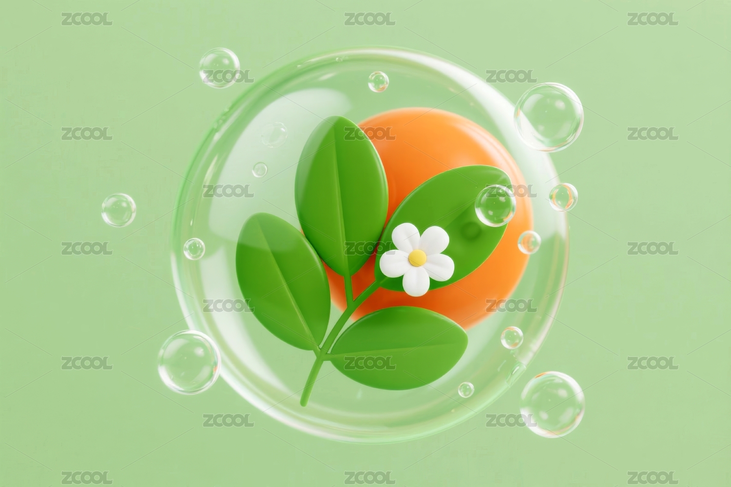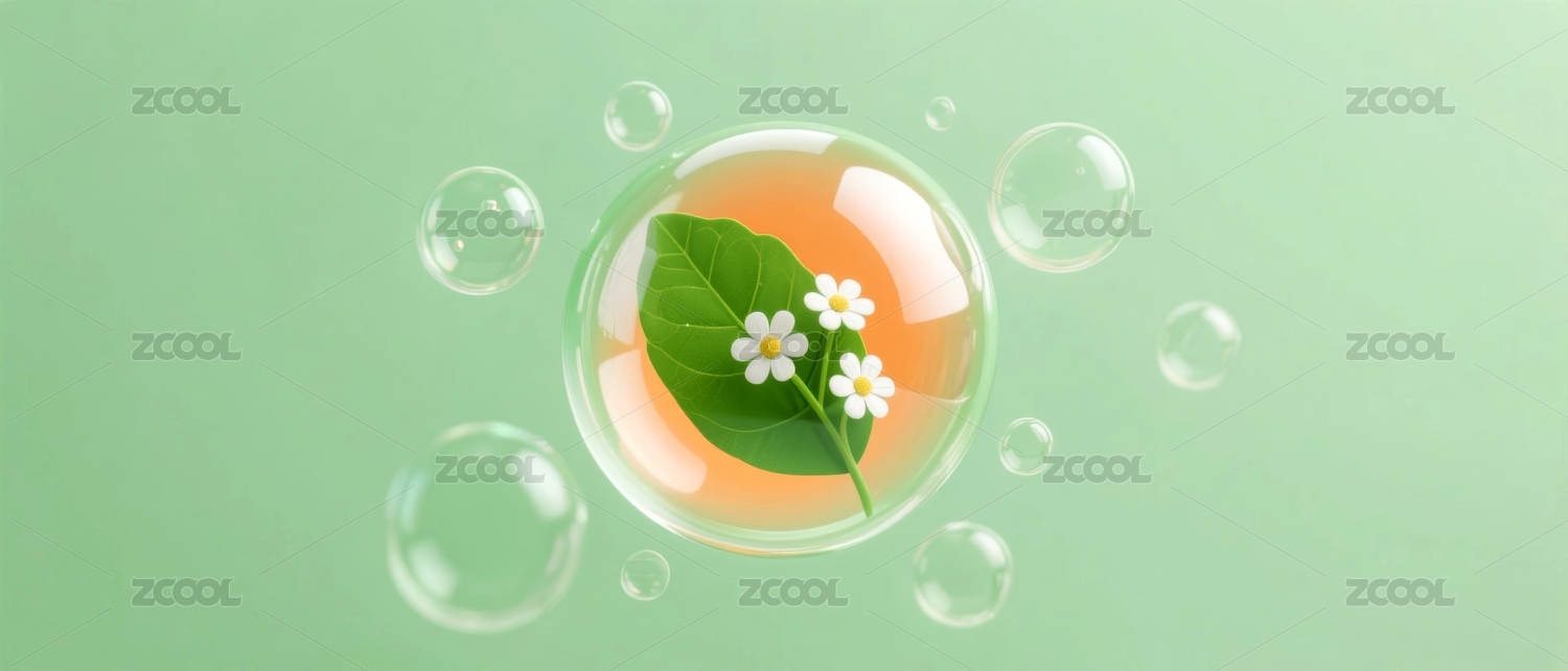 光滑水面绿色背景中的泡泡化妆品成分插图