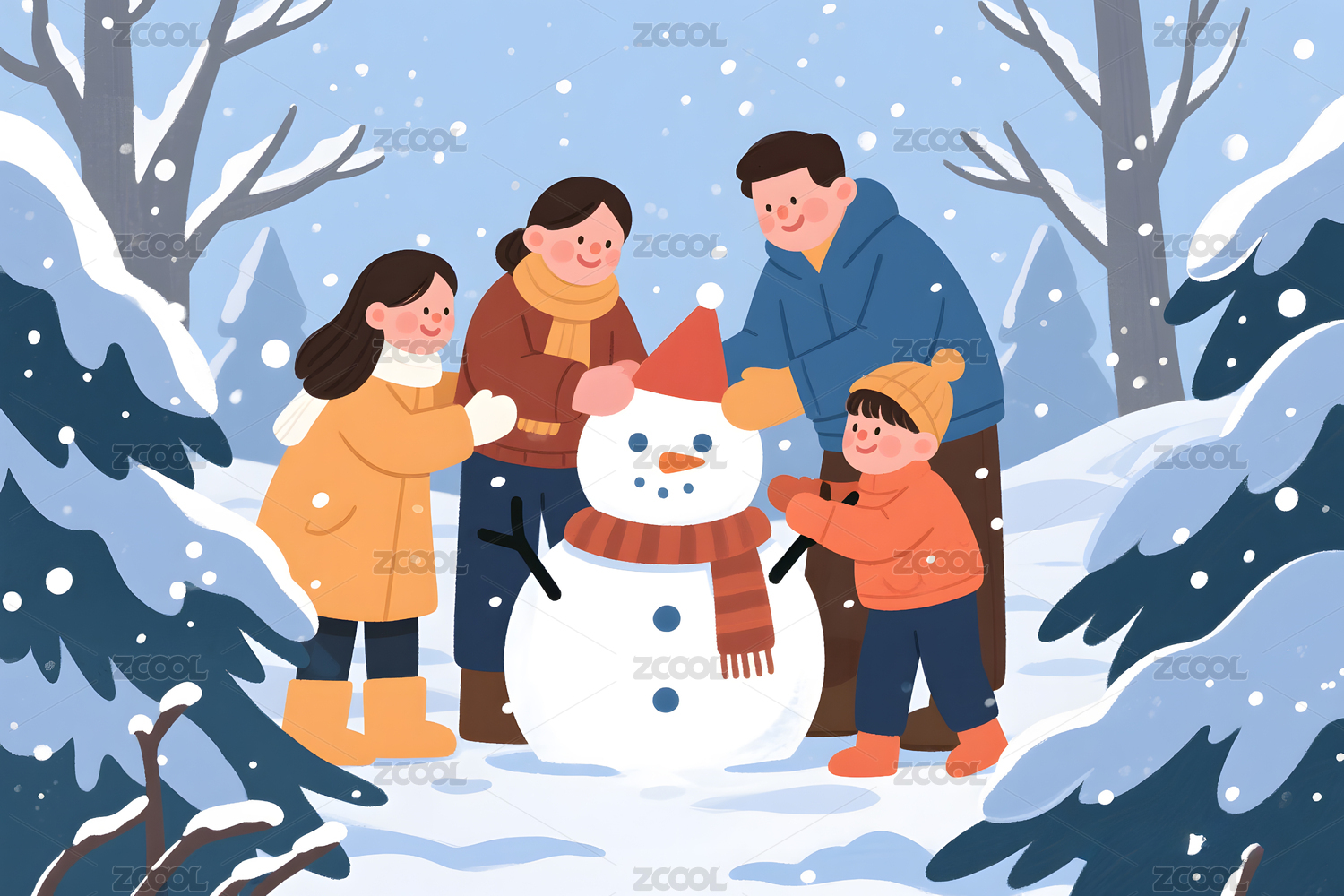 冬天,雪人,亲子,户外,围巾,树枝,雪花,快乐,父亲,孩子