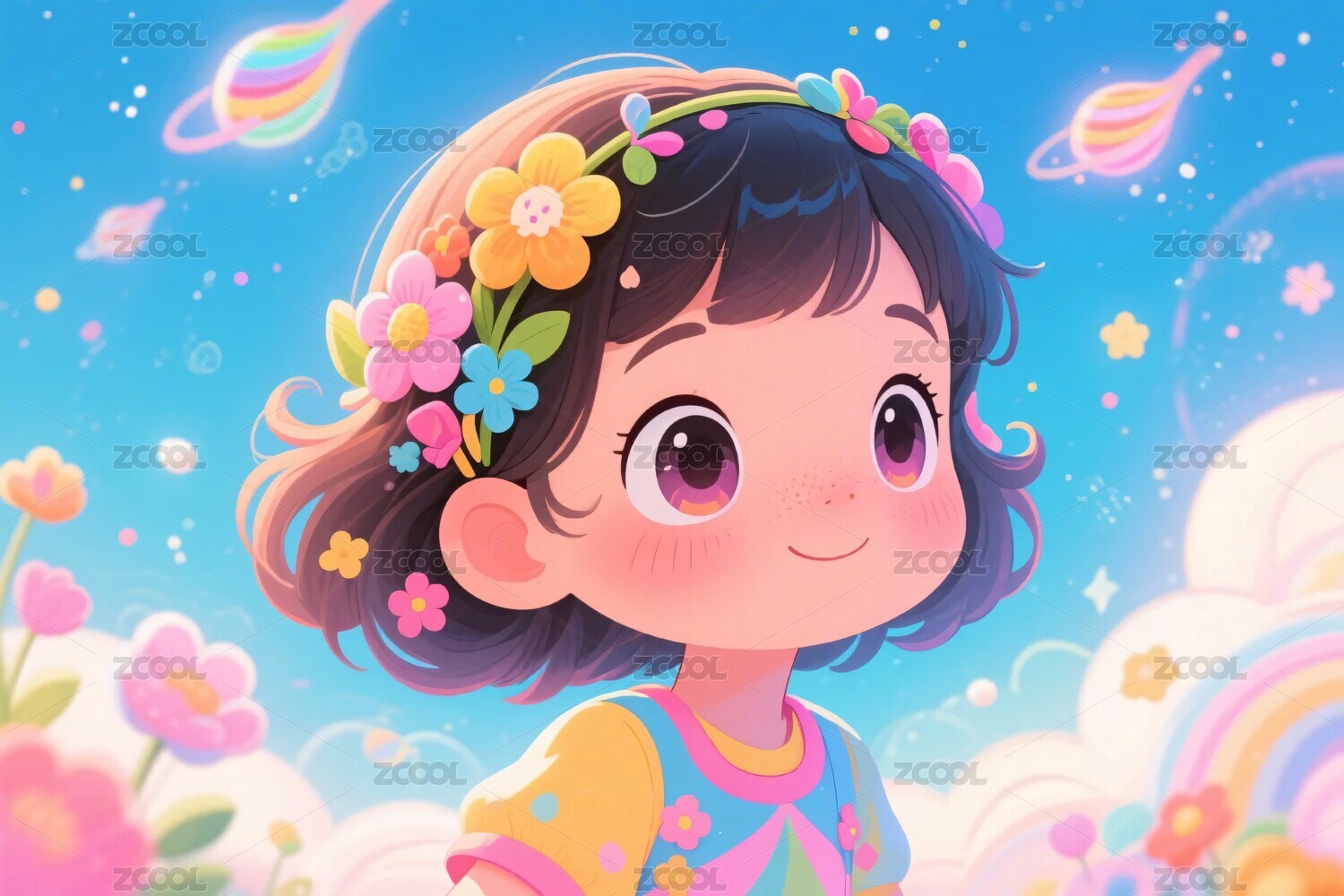 游乐园拿着气球奔跑的可爱卡通女孩插画