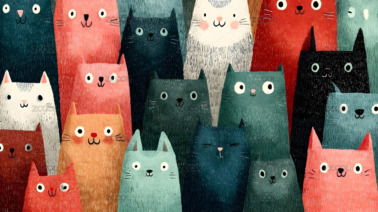 手绘彩色卡通猫猫质感笔触抽象装饰画背景