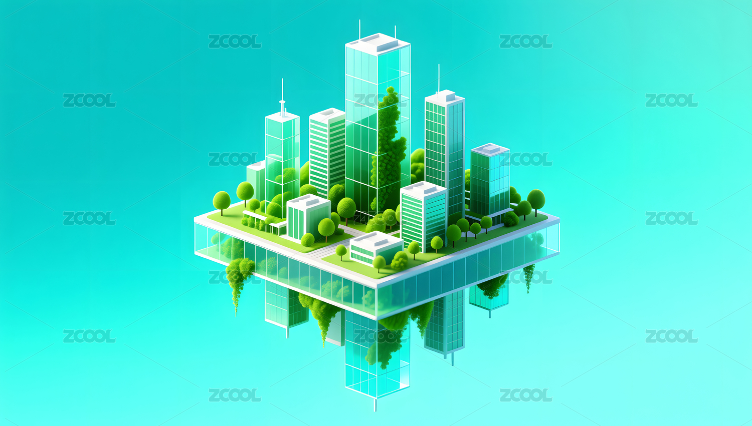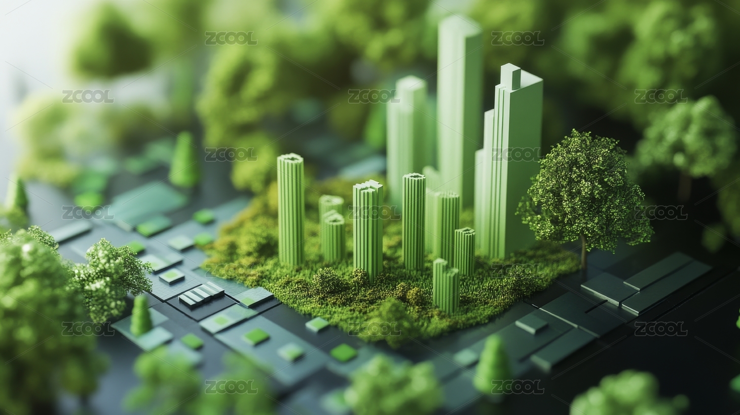 绿色生态现代城市模型沙盘3D卡通立体插画