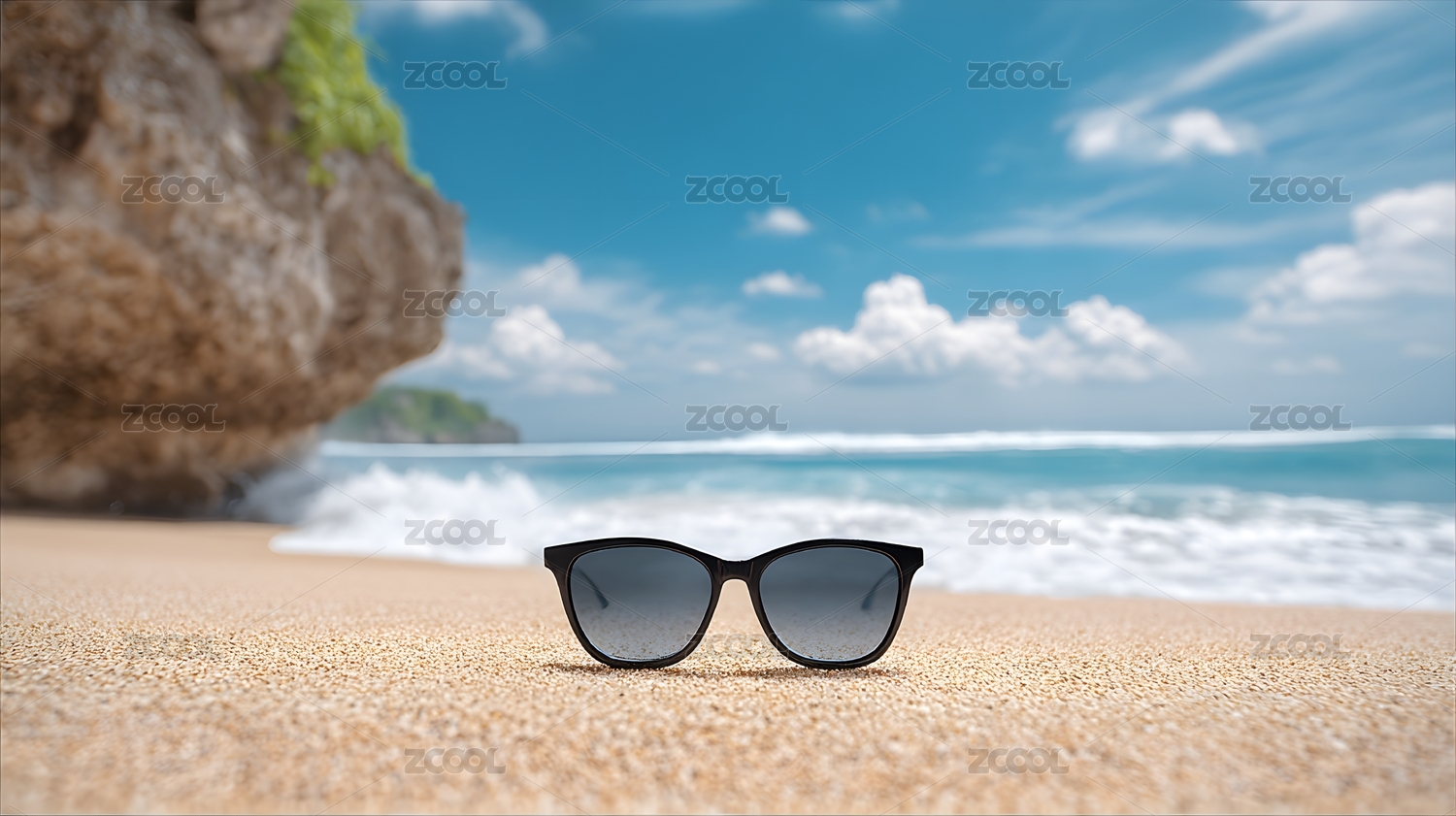 沙滩上的墨镜与碧海蓝天