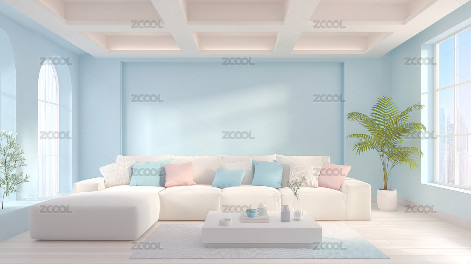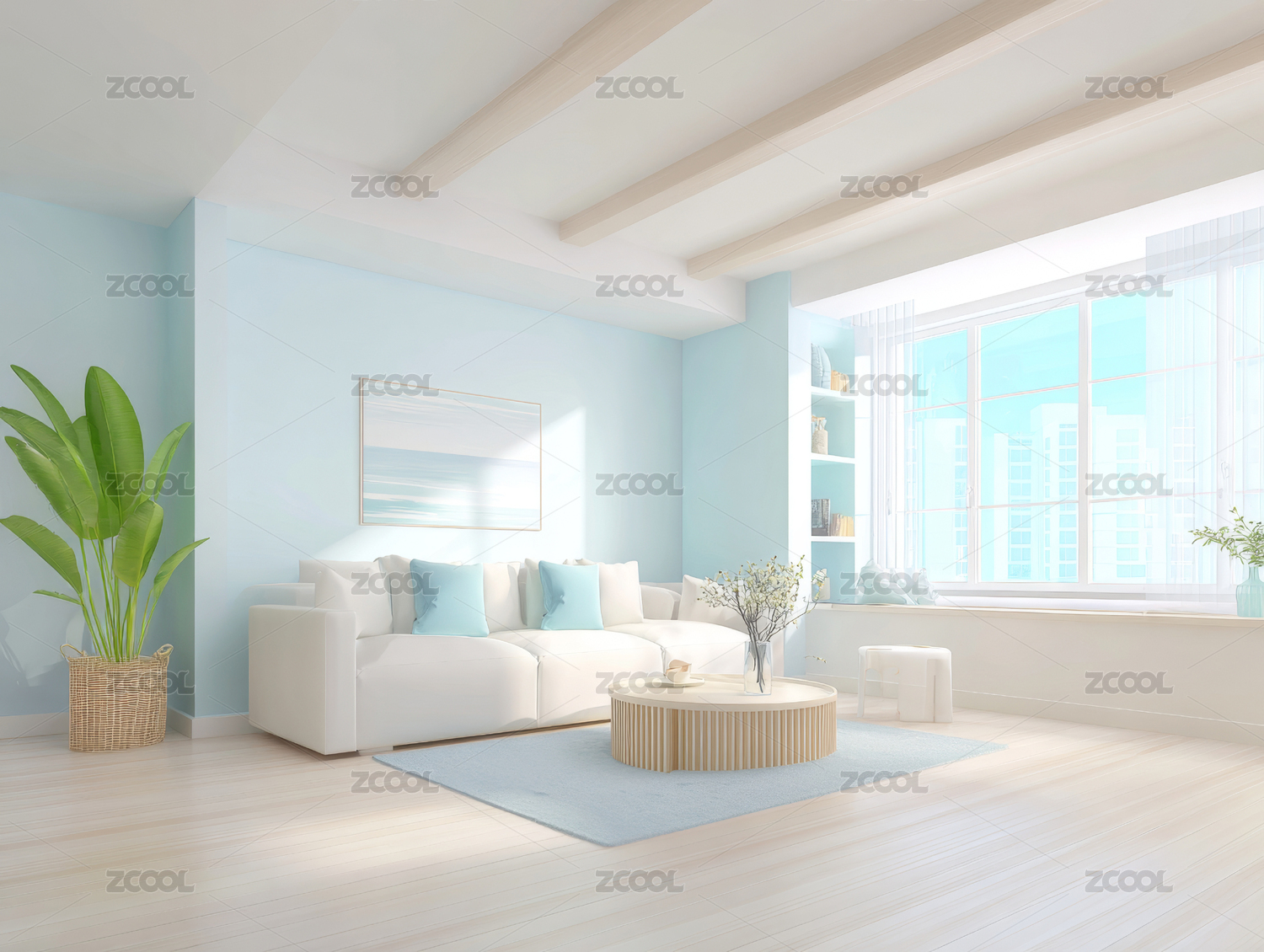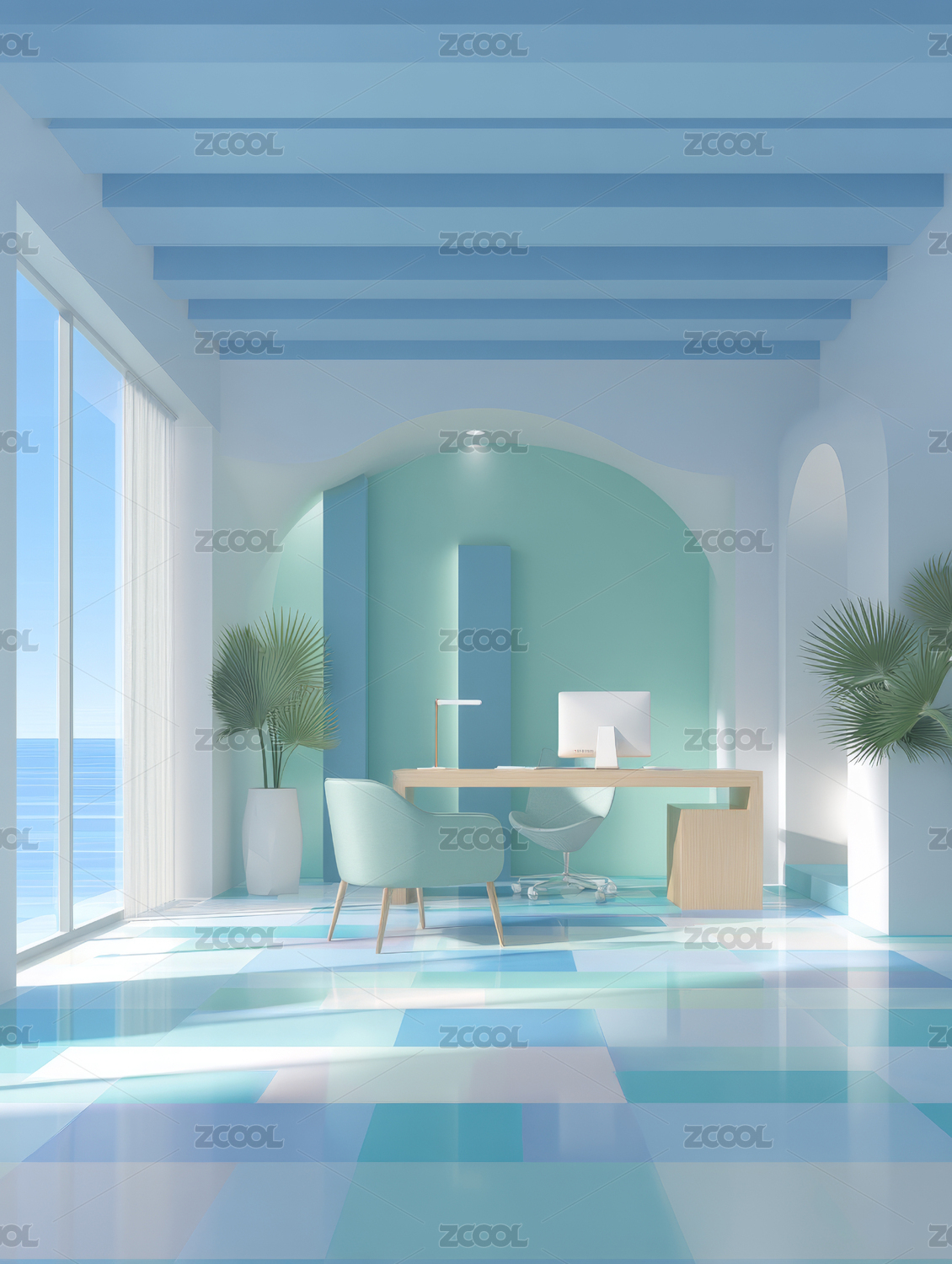 办公桌,椅子,植物,窗户,蓝色,墙壁,电脑,沙发,书柜,自然光