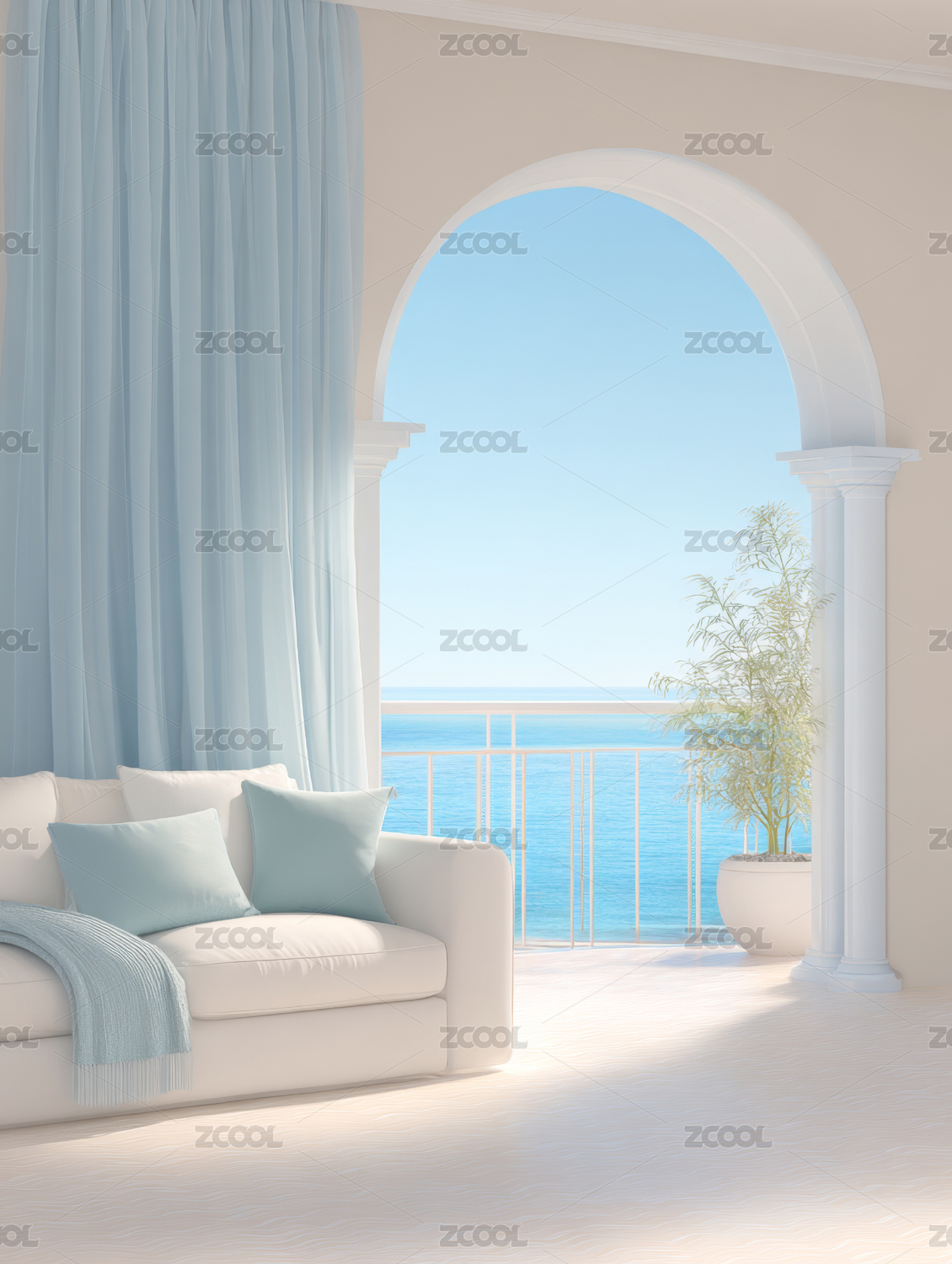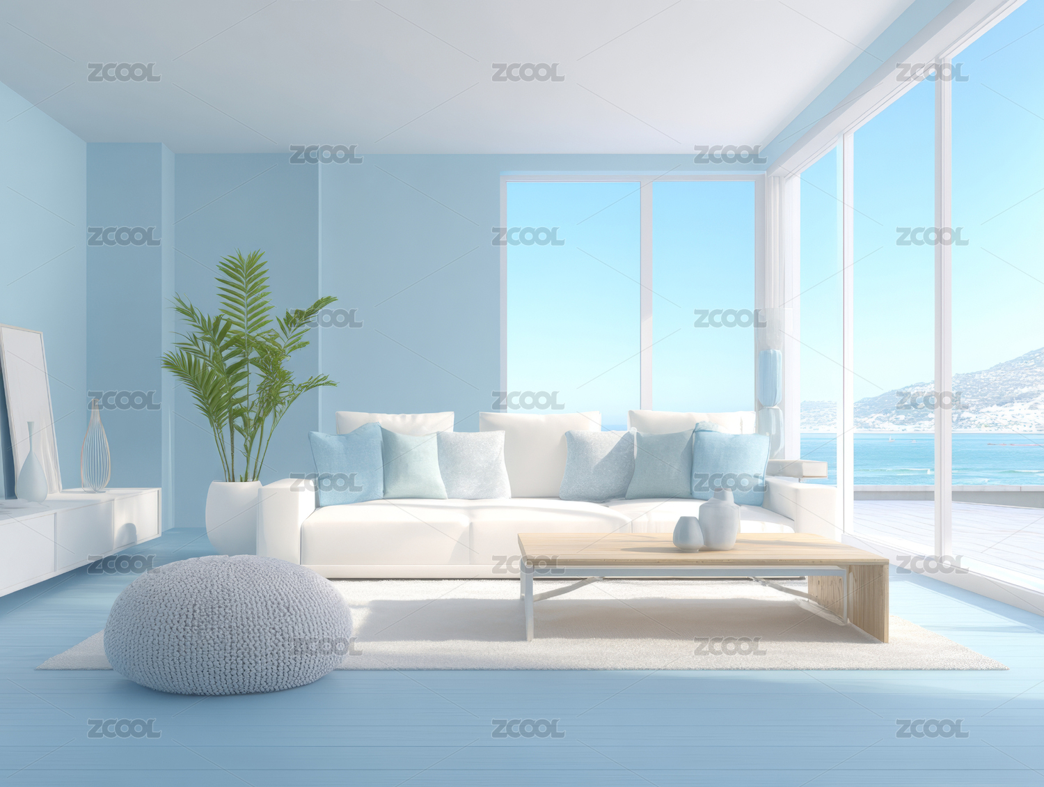 蓝色窗帘海边客厅
