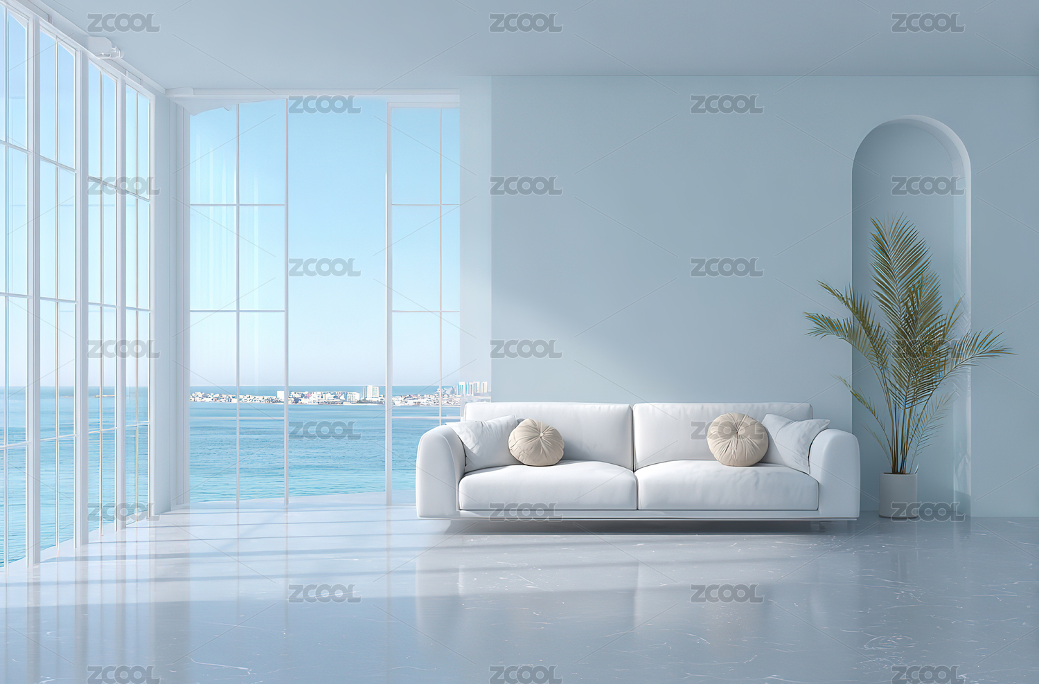 浅蓝色客厅沙发临窗望海景