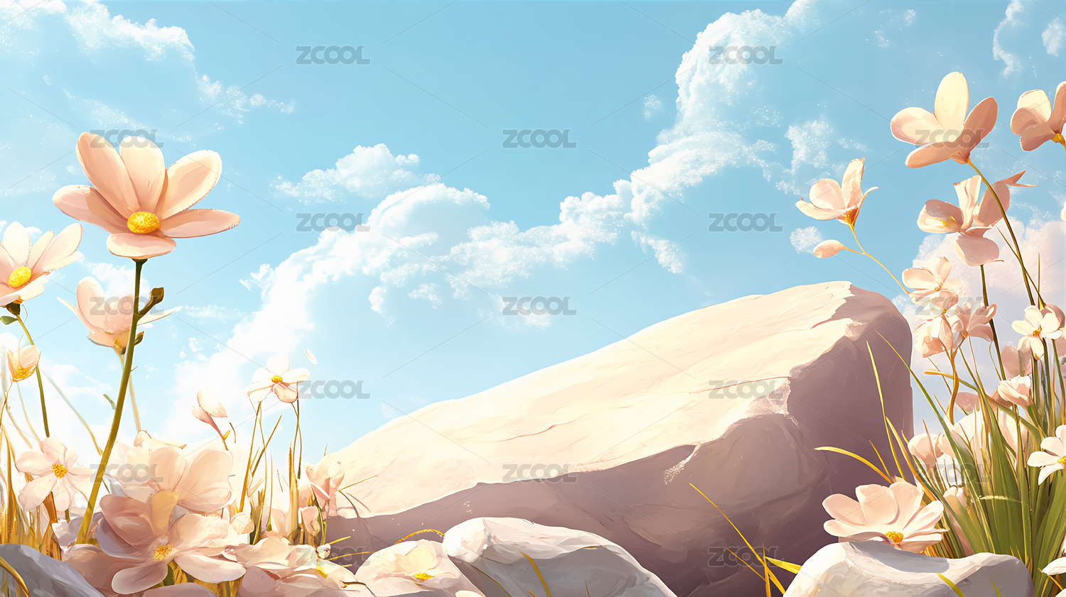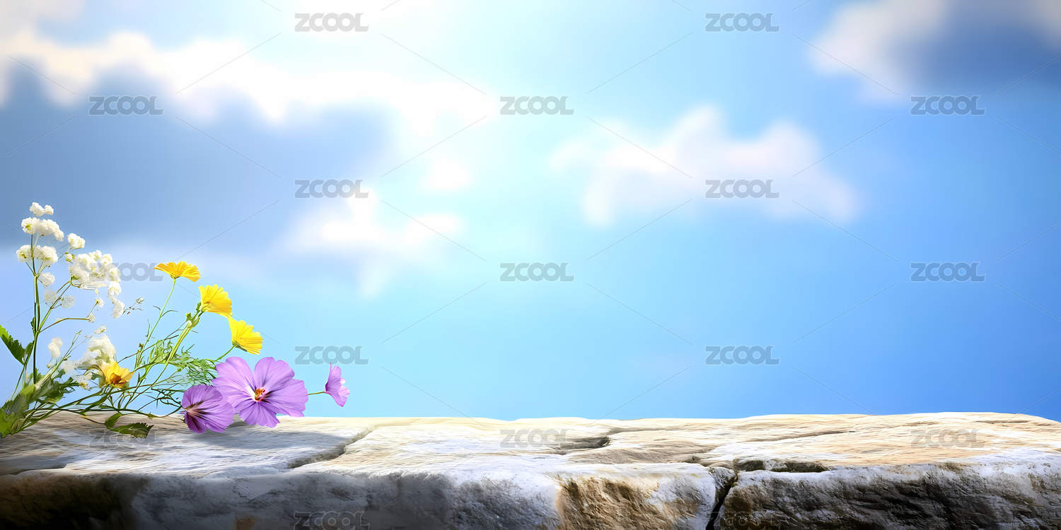 蓝天花卉石台自然背景