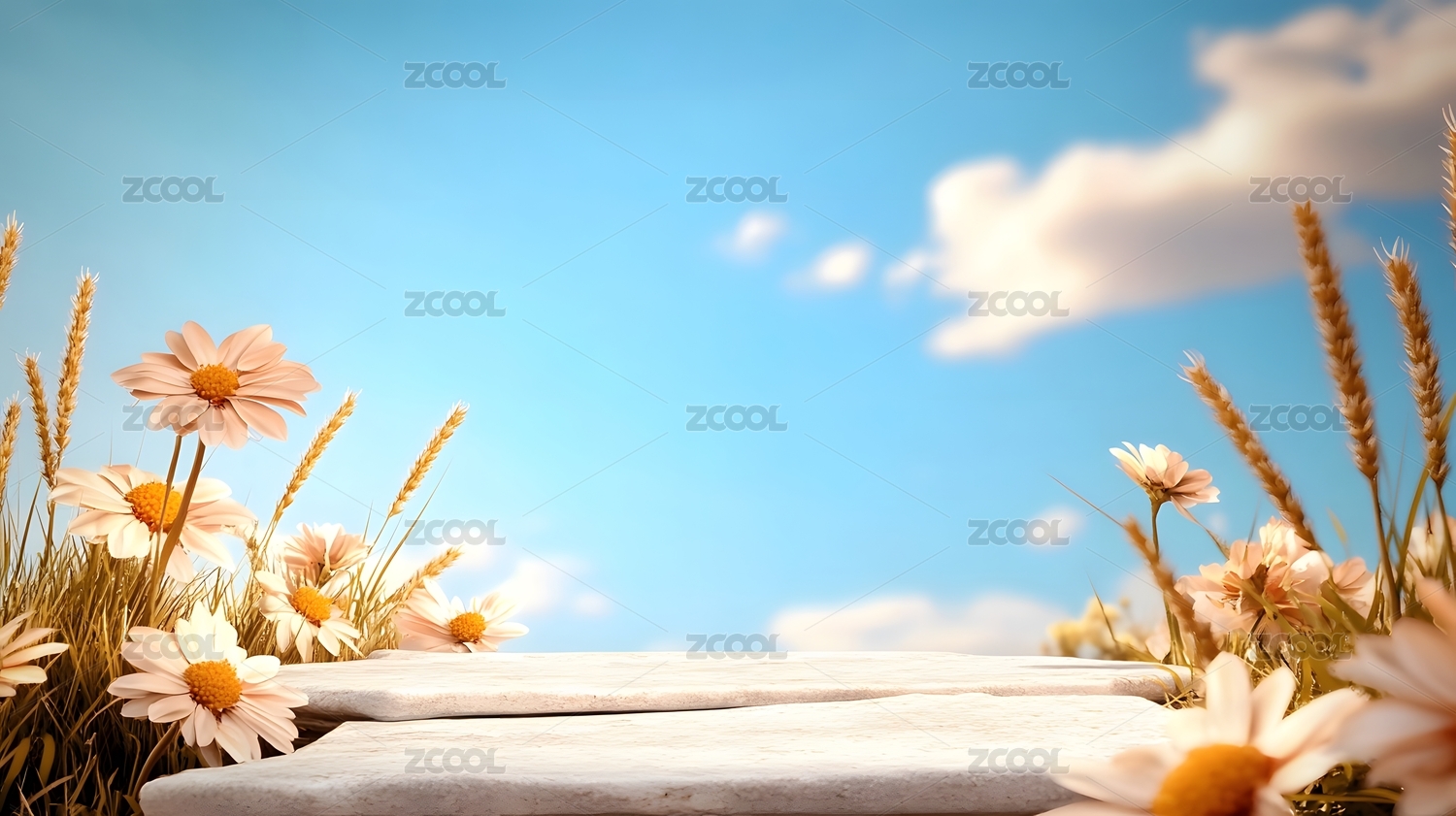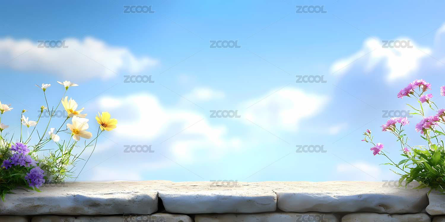 蓝天花卉背景展示台