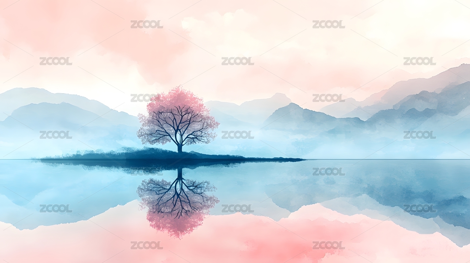 粉色树与倒影的风景