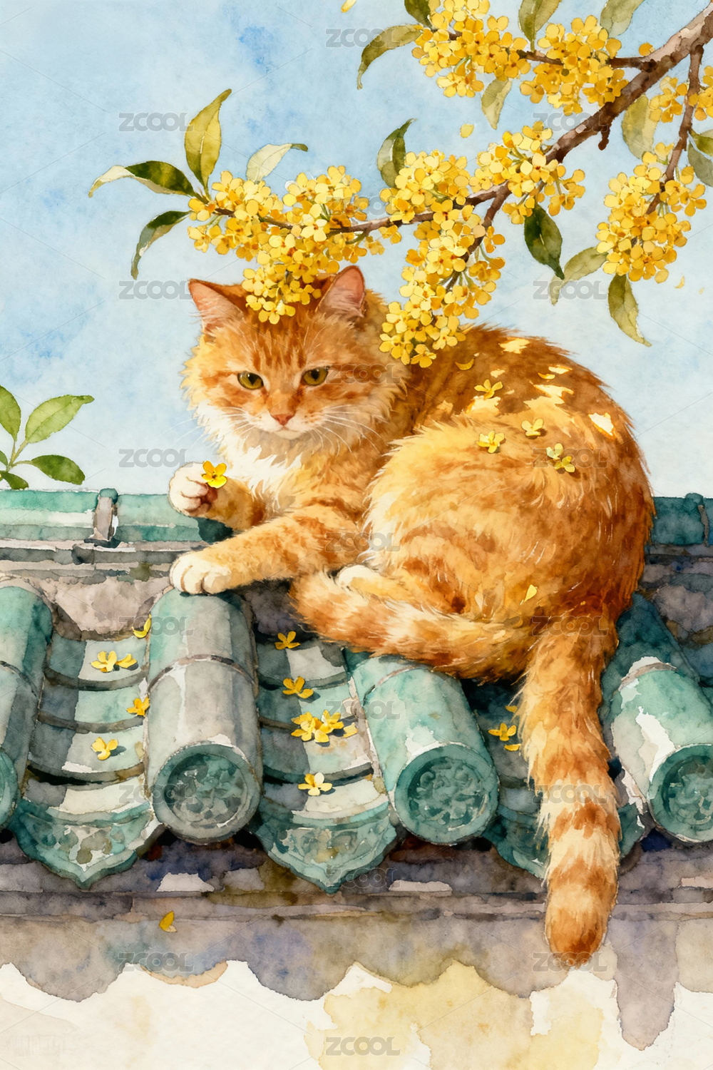 古建筑上栖息的小猫水彩水墨国画
