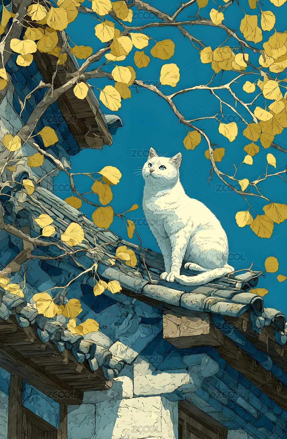 白猫瓦檐仰望金叶秋景