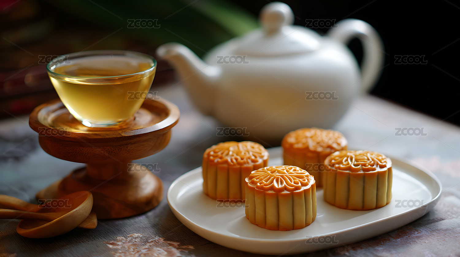 茶杯,茶壶,点心,木盘,青花瓷,茶艺,饮品,传统,室内,美食
