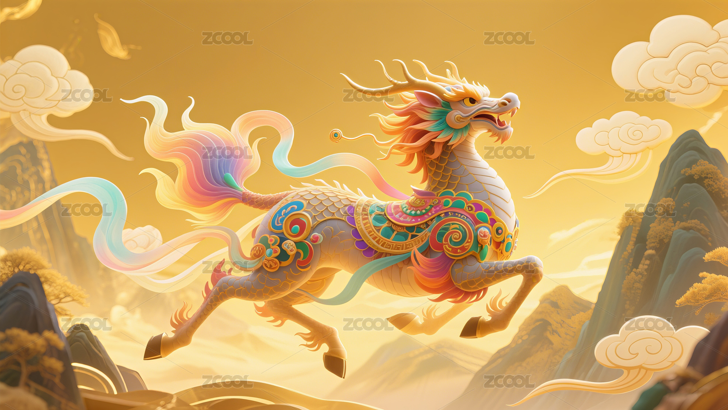 敦煌色梦幻麒麟祥云国风插画