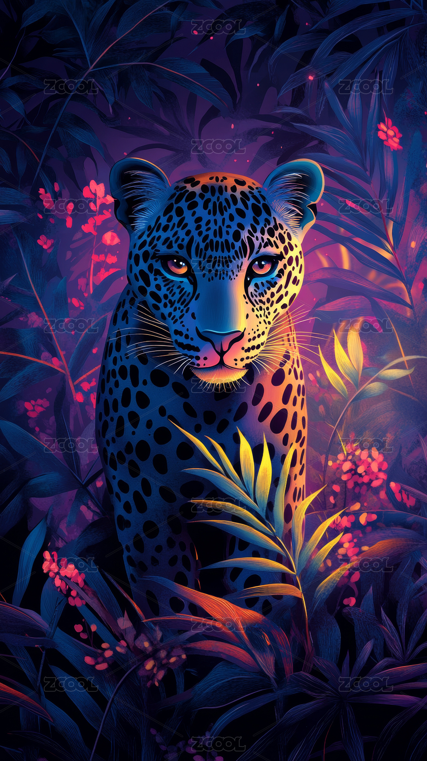 赛博朋克蓝紫色金钱豹在树上的场景插画
