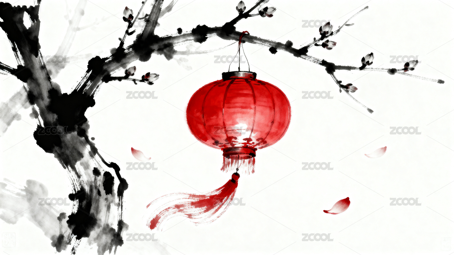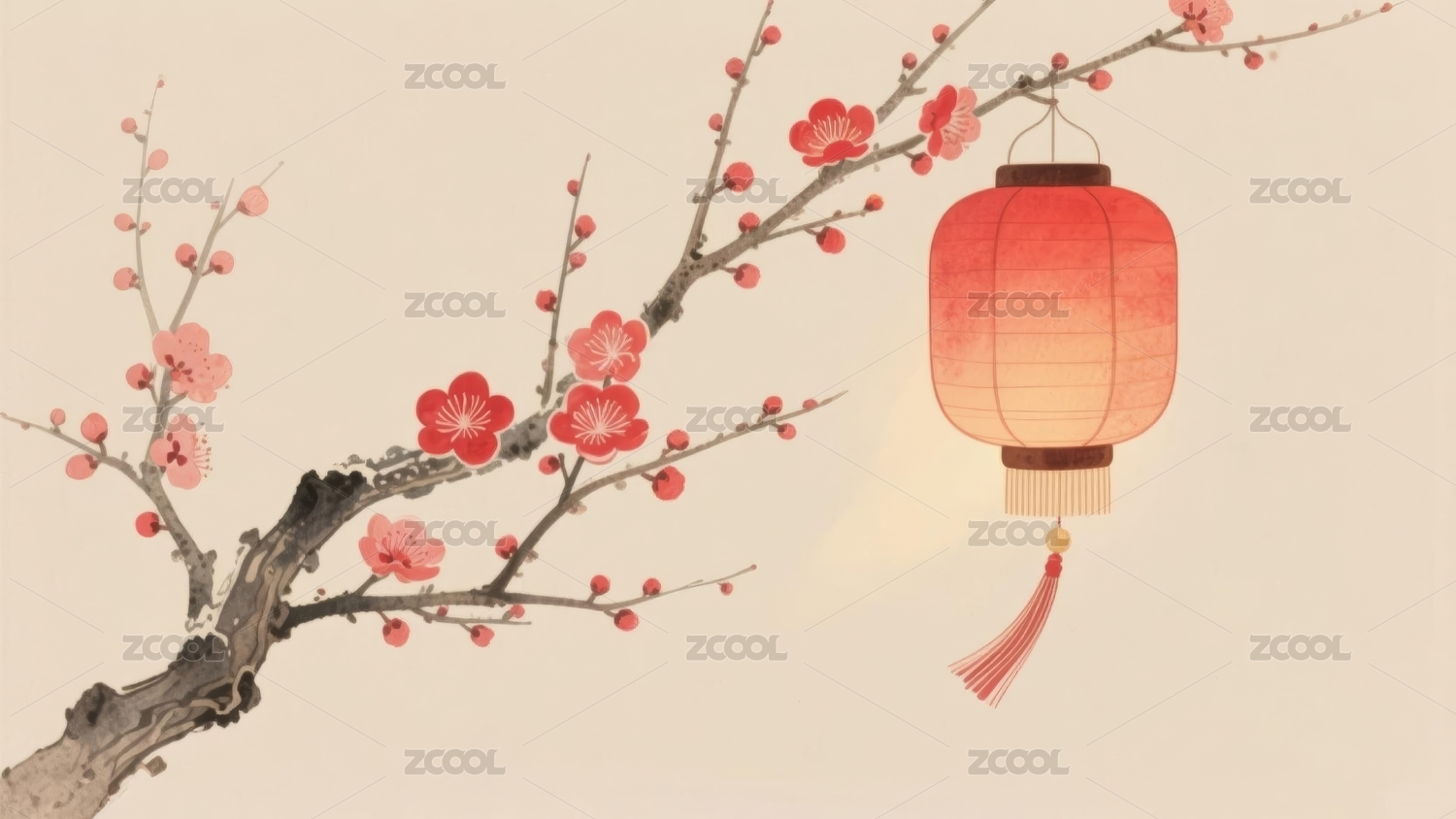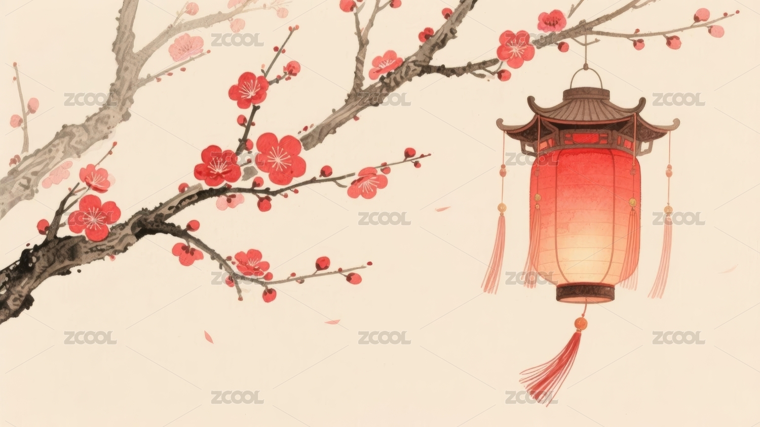 水墨画风红灯笼与梅花枝