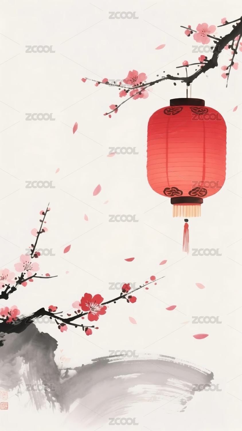 红灯笼与梅花的水墨画