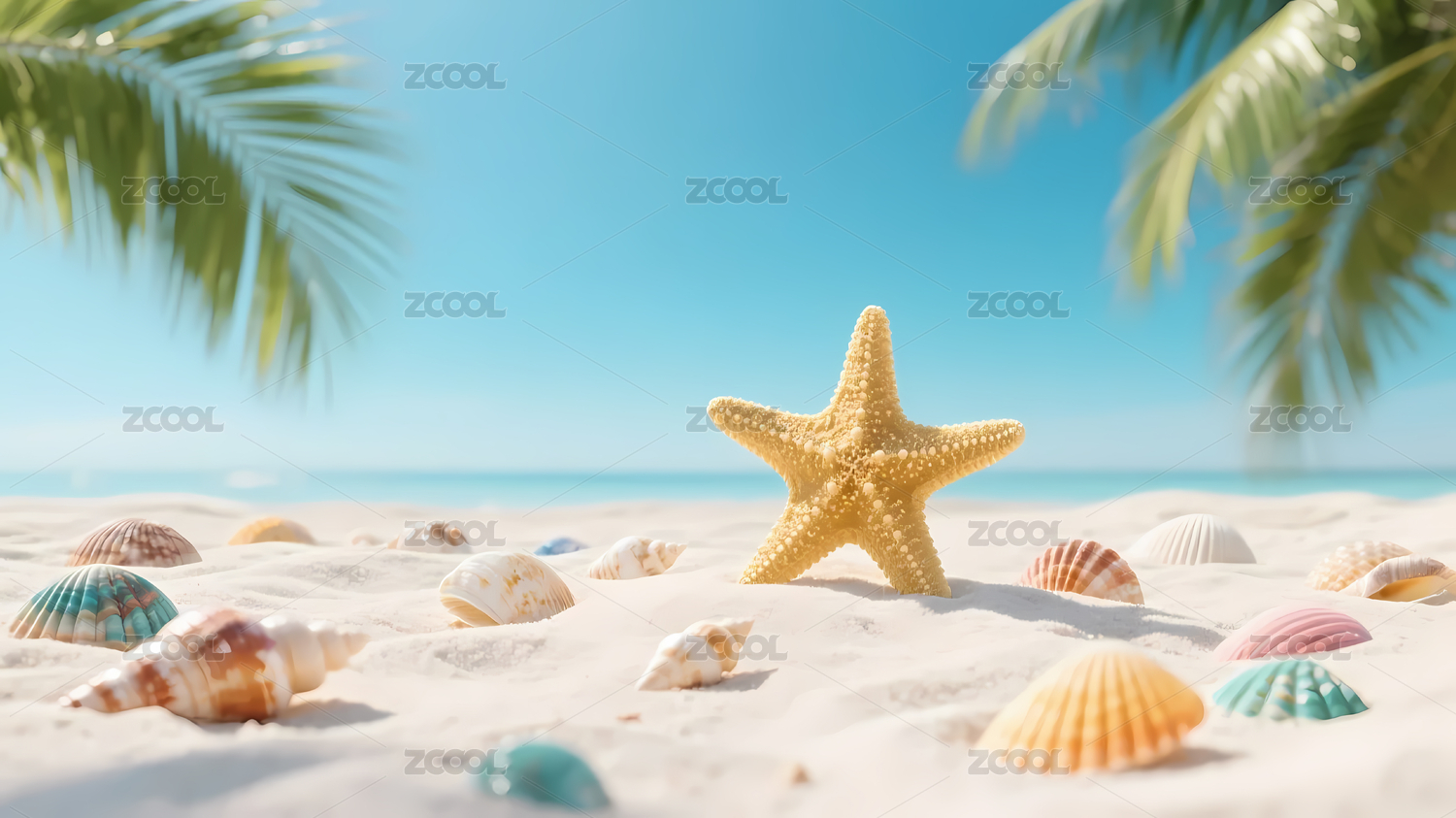 植物,阳光,天空,蓝天,星星,海星,海滩,贝壳,沙子,椰子树