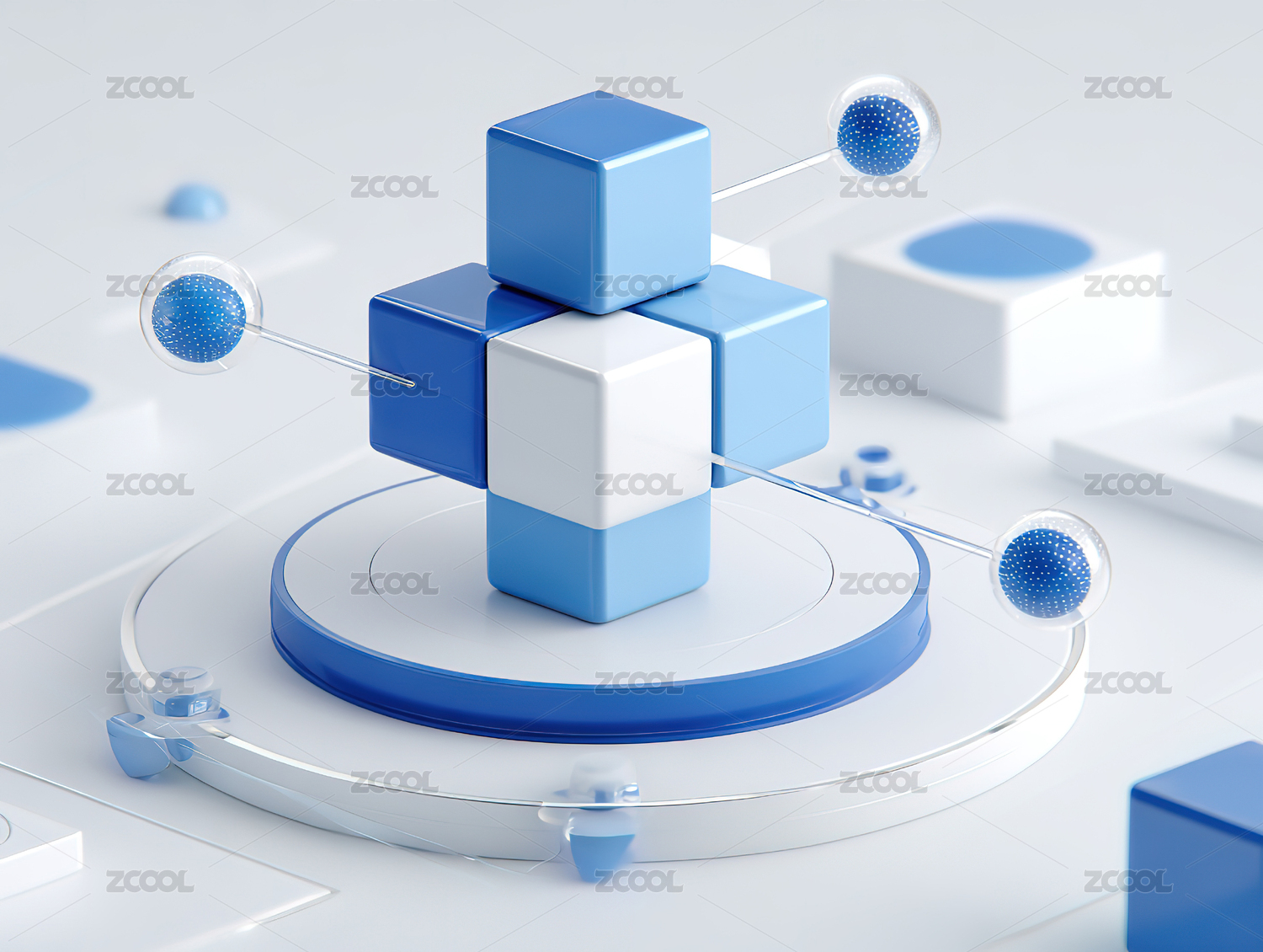 蓝色立方体结构与球体连接
