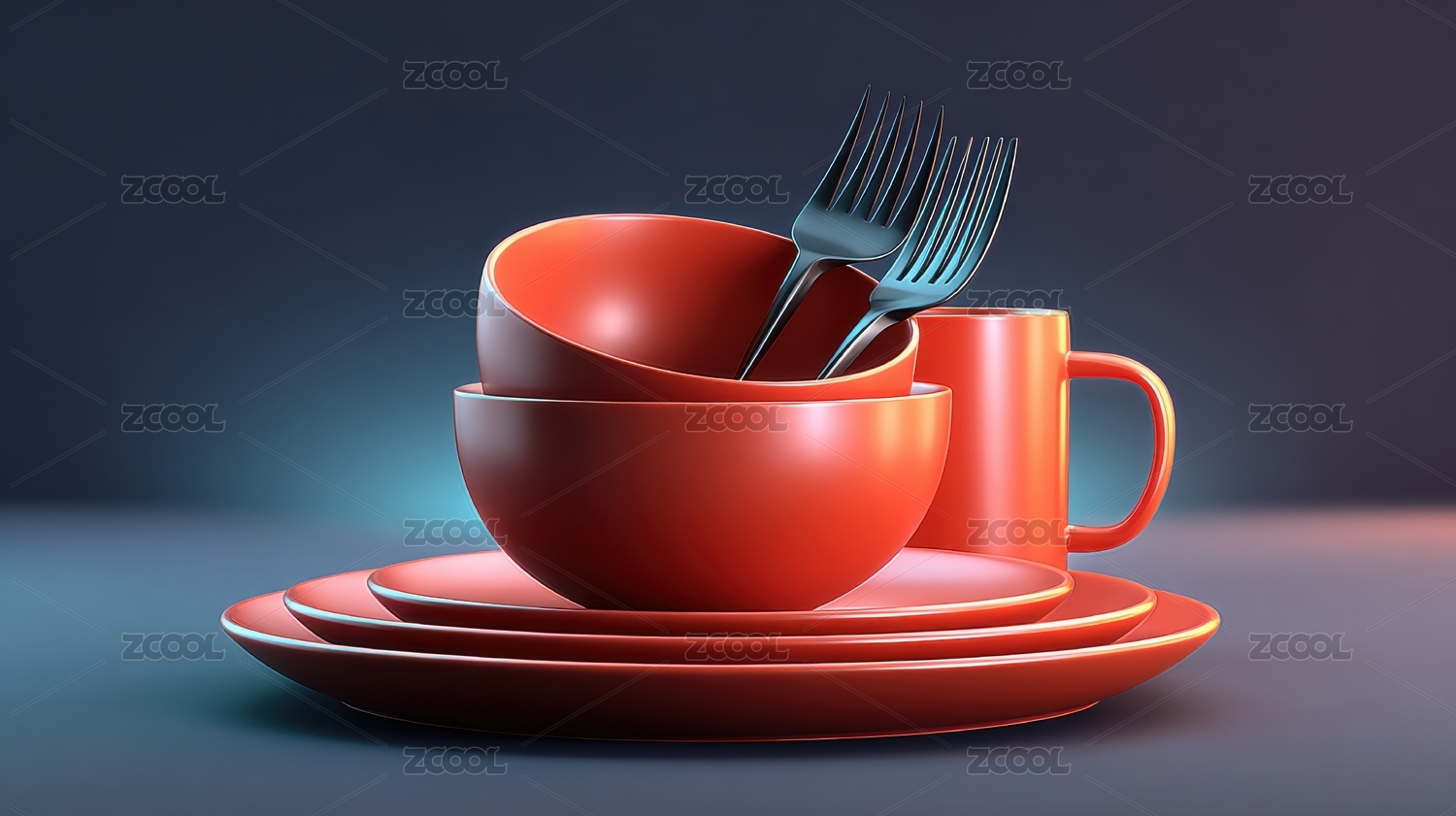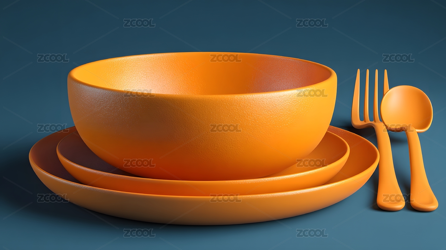 橙色餐具与碗盘组合 静谧蓝色背景