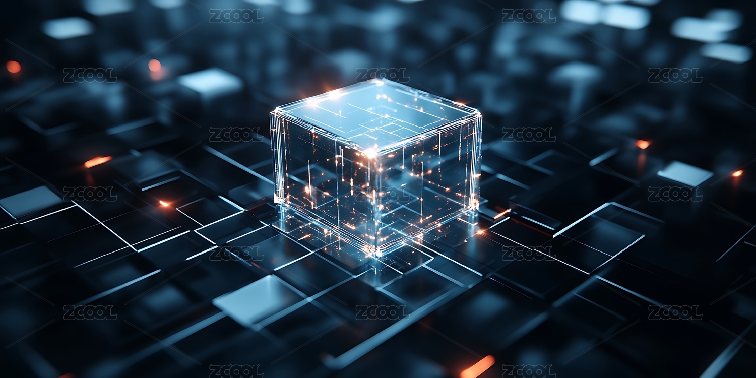 发光立方体悬浮于科技感背景中