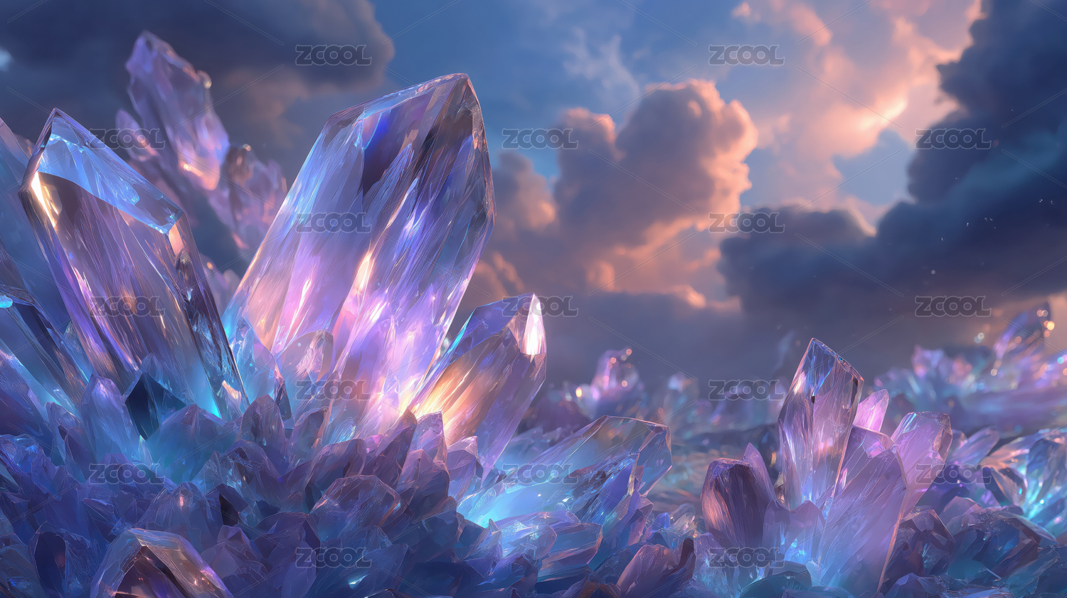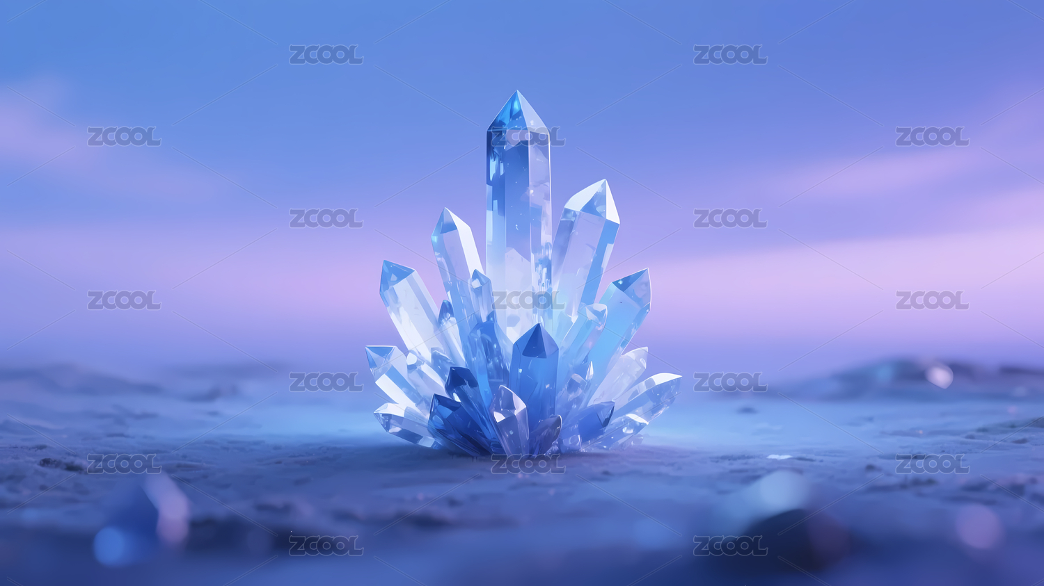 蓝色透明水晶与渐变紫色天空