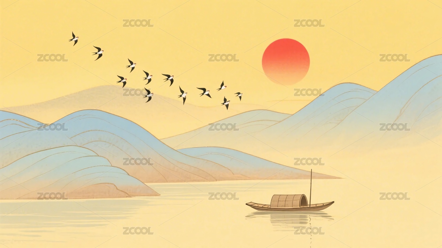 山水,落日,孤舟,飞鸟,中式,插画,意境,自然,风景,艺术