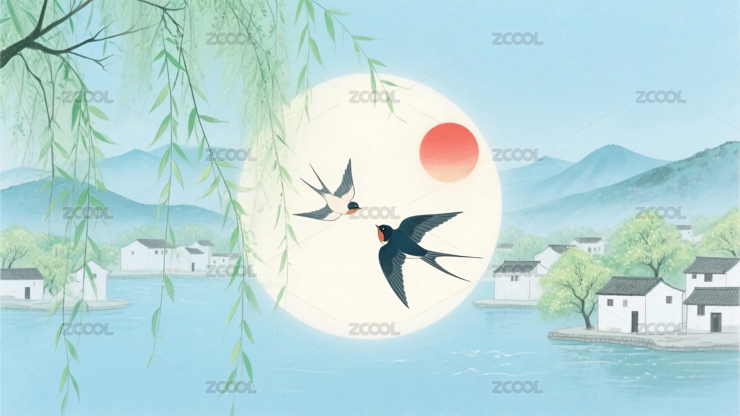 燕子,村庄,柳树,红日,山水,插画,风景,自然,春天,中式
