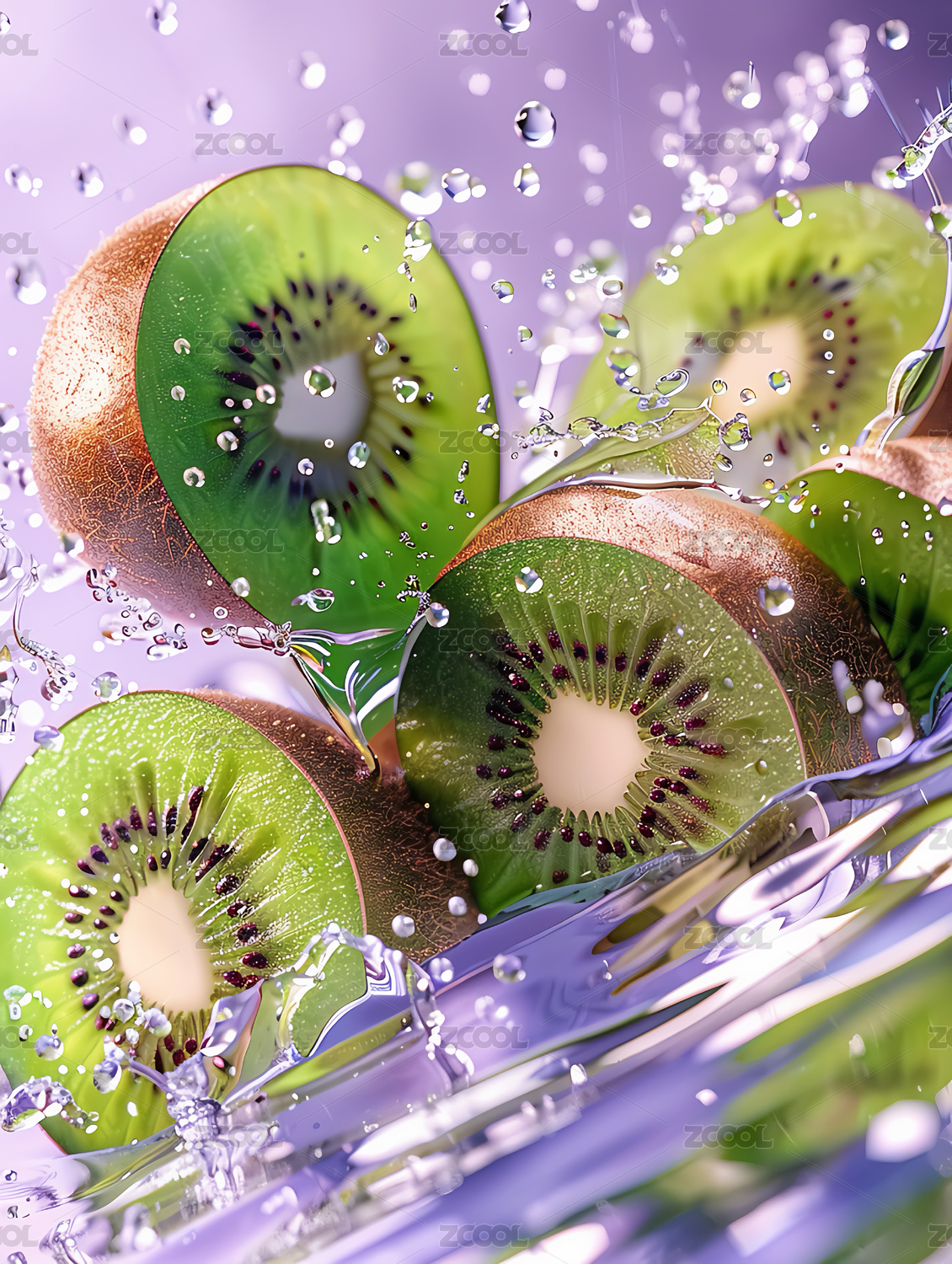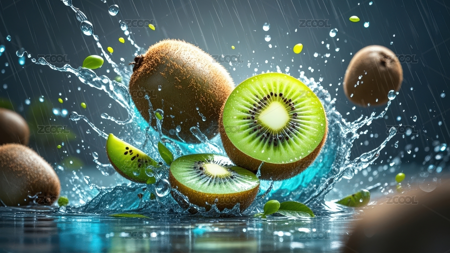 写实立体溅起水花的新鲜猕猴桃汁水四溢
