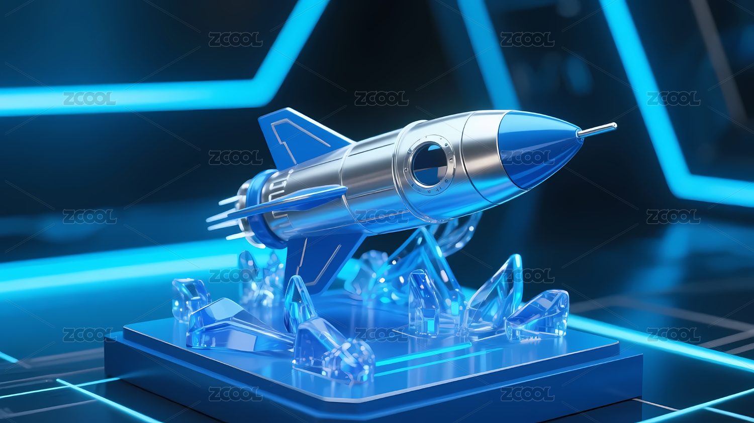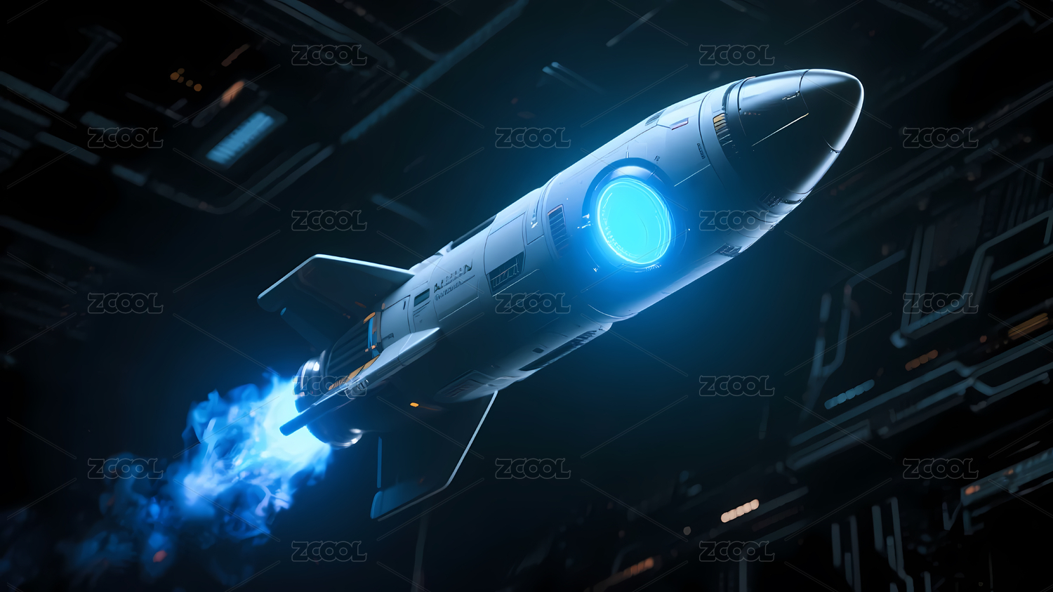 银色火箭蓝色太空光线点缀