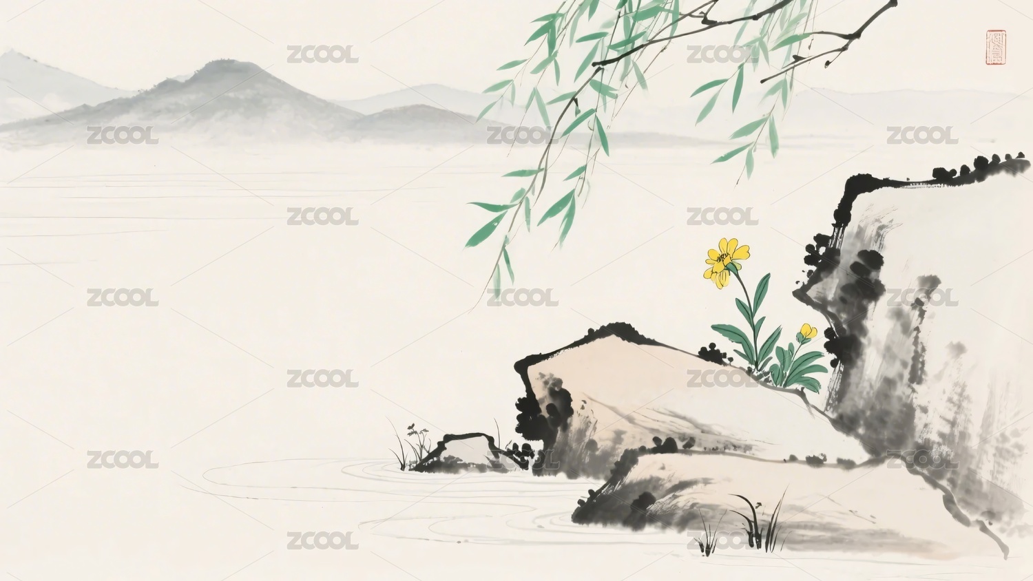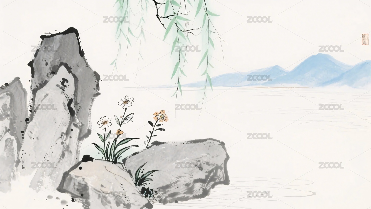 石头,柳枝,花卉,山水,插画,古风,中式,写意,水墨画,景色