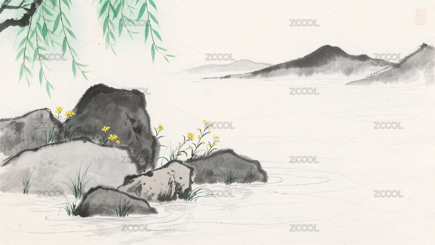 水墨山水间的柳石黄花景