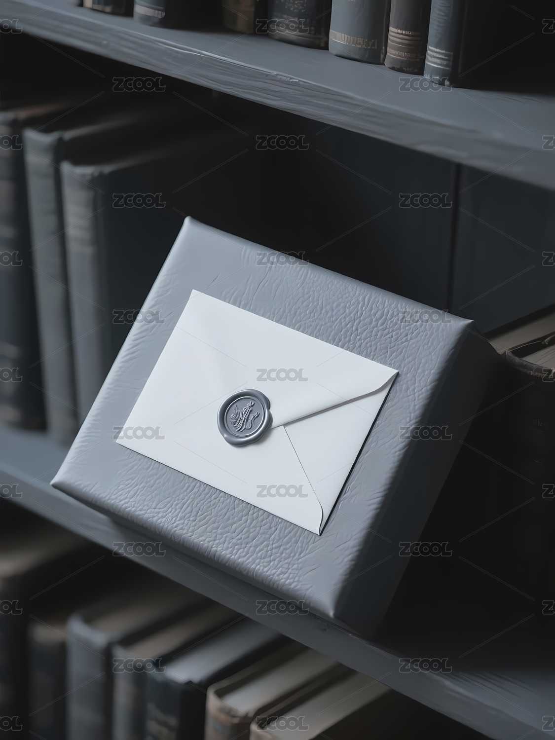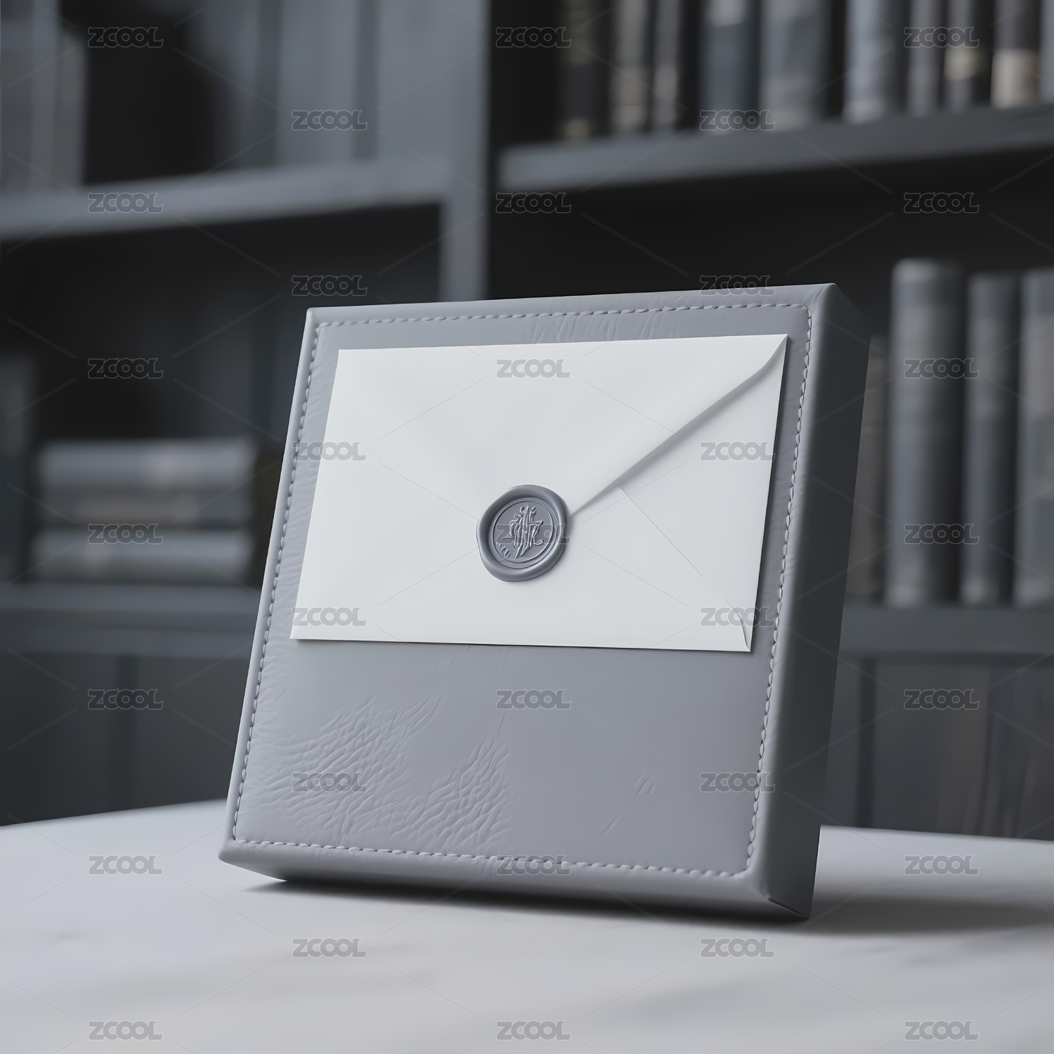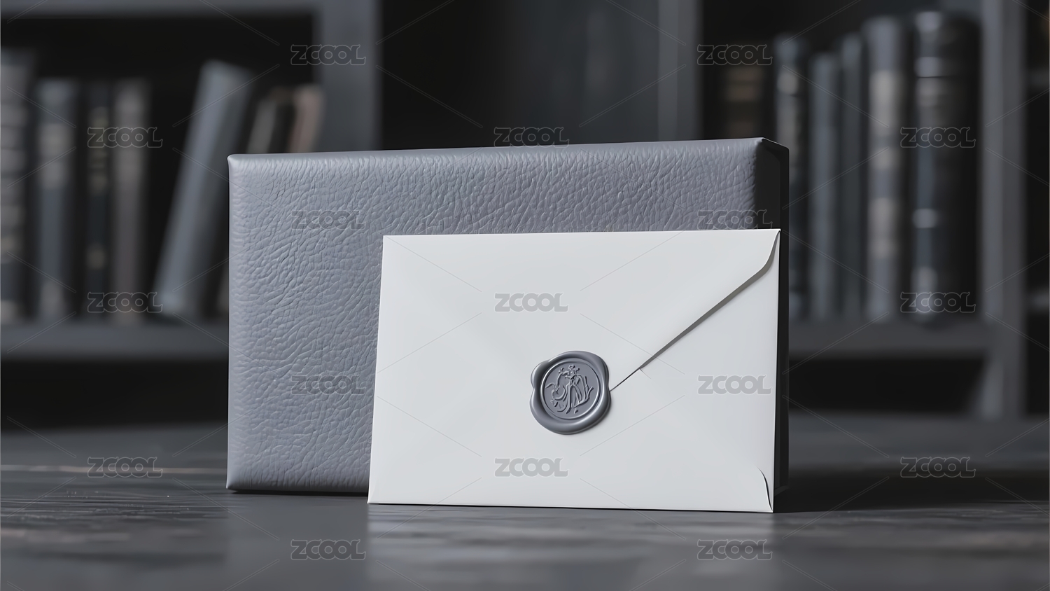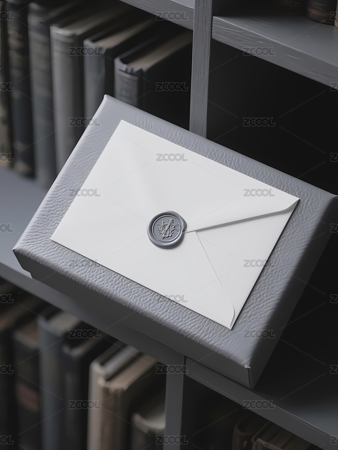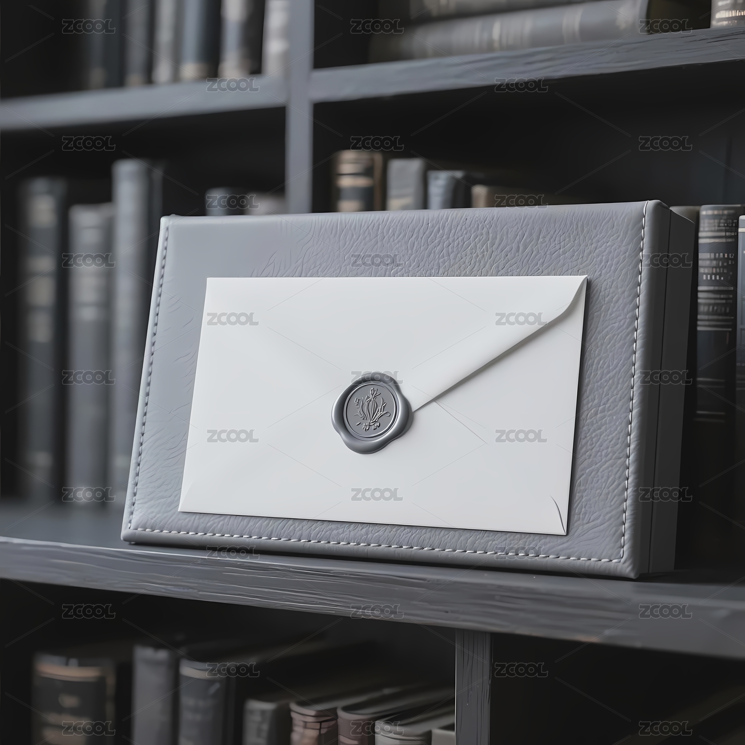 白色信封,简约风格,室内环境,木质桌面,静物摄影,柔和光线,皮革盒子,书架背景,蜡封印章,办公用品