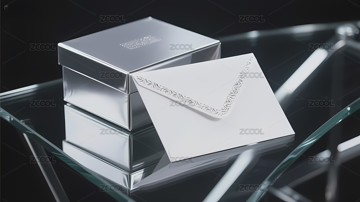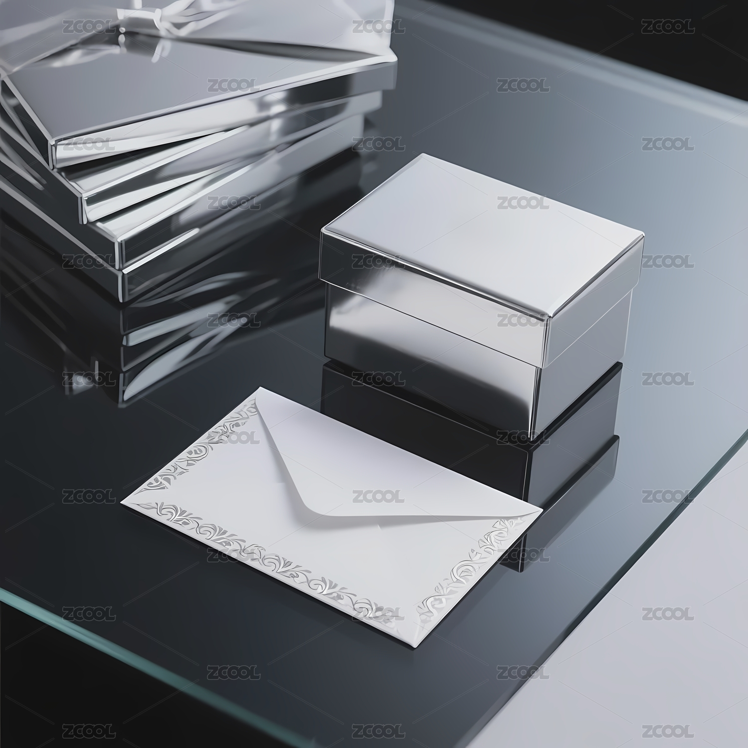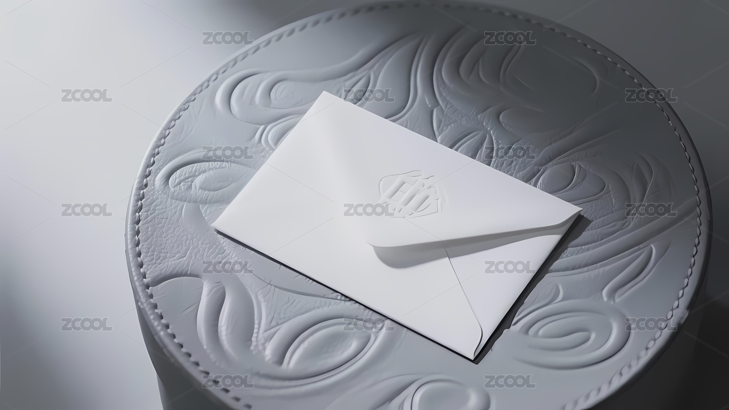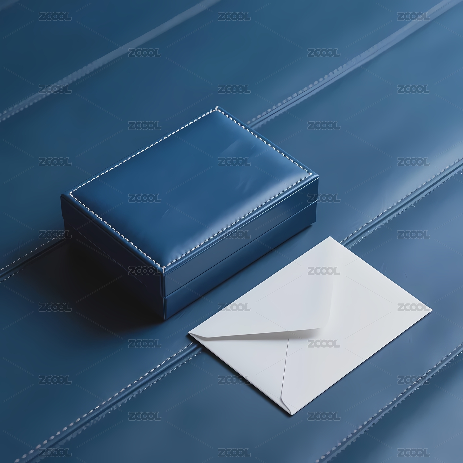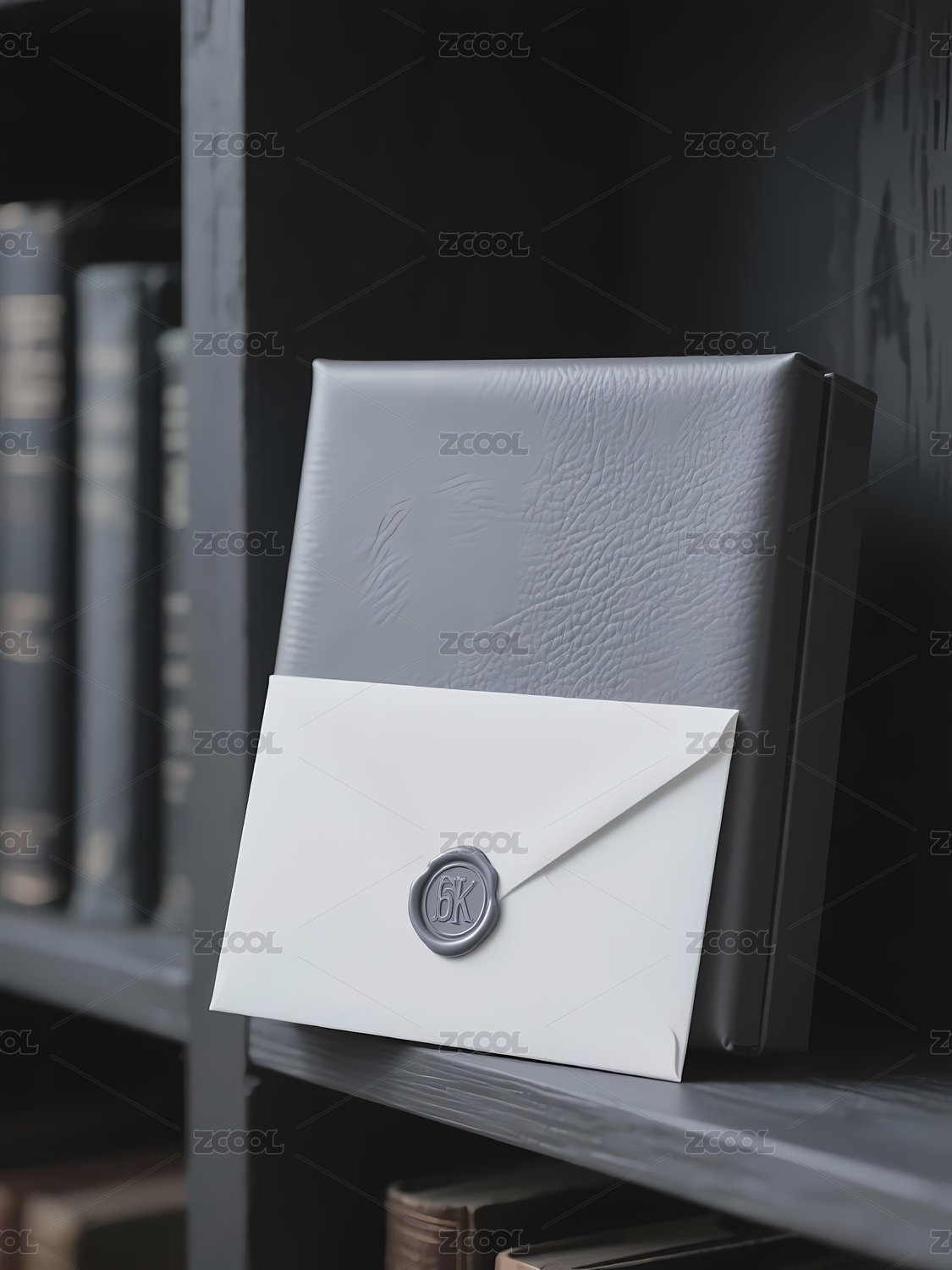 白色信封,简约风格,室内环境,木质桌面,静物摄影,柔和光线,皮革盒子,书架背景,蜡封印章,办公用品